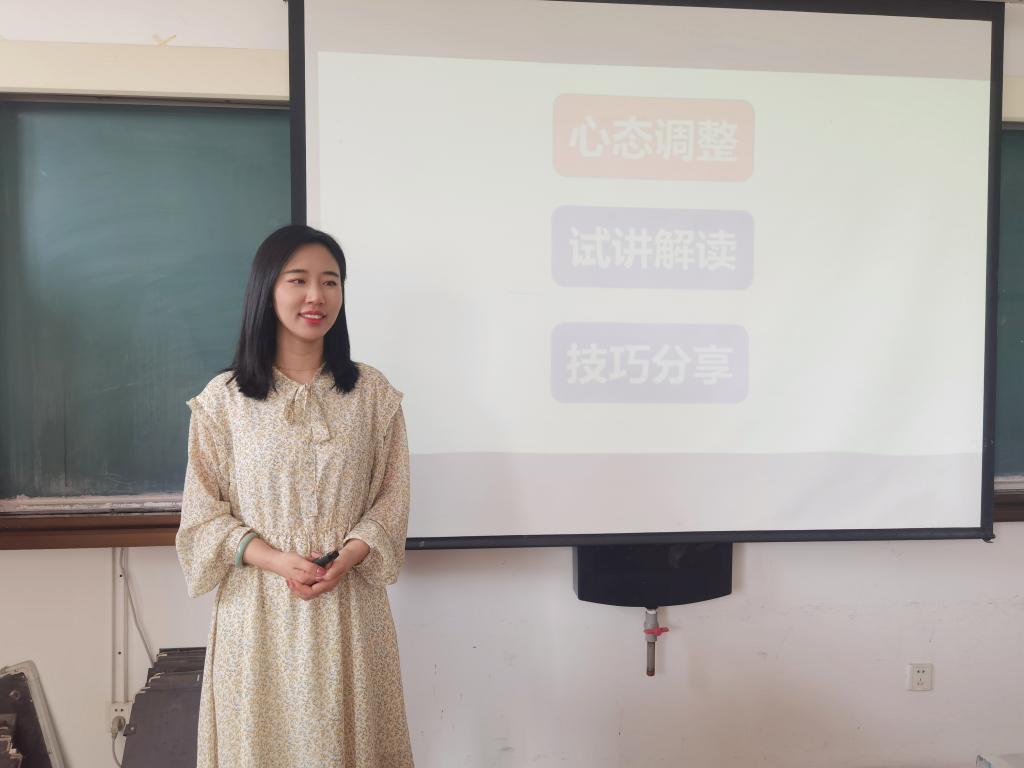 讲座从心态调整、试讲解读和技巧分享三个方面展开。首先,牟老师鼓励大家要树立信心、明确目标、立即行动,从而做好心态调整。接着,牟老师指出试讲是“内外兼修”的过程,带领大家分析了大赛评分标准,并清晰地讲解了应如何针对评分标准有效备赛。最后,牟老师分享了提高备课效率的一些小技巧,同学们都受益匪浅。