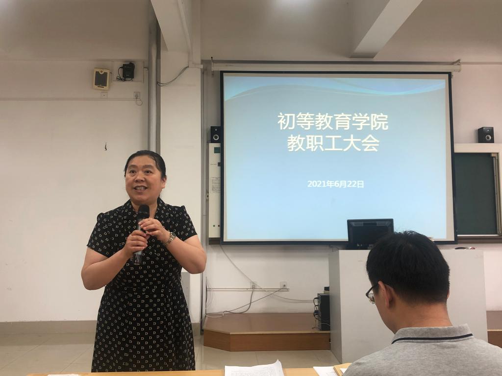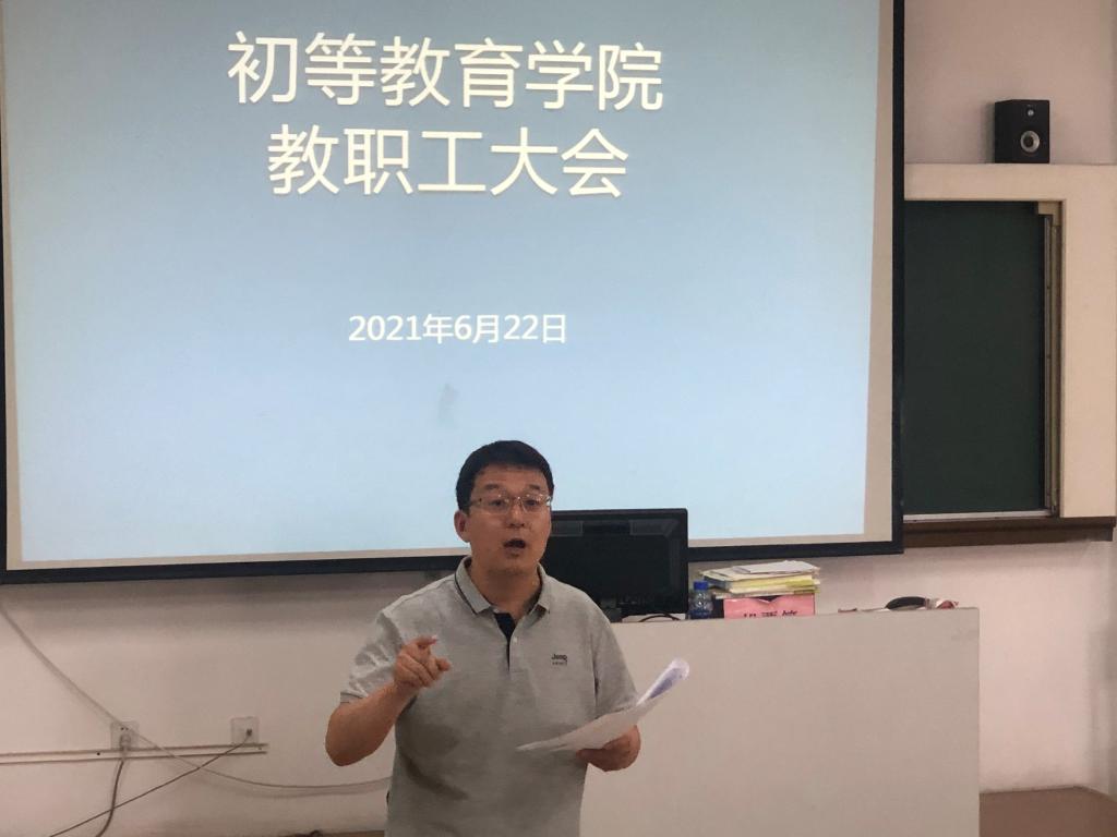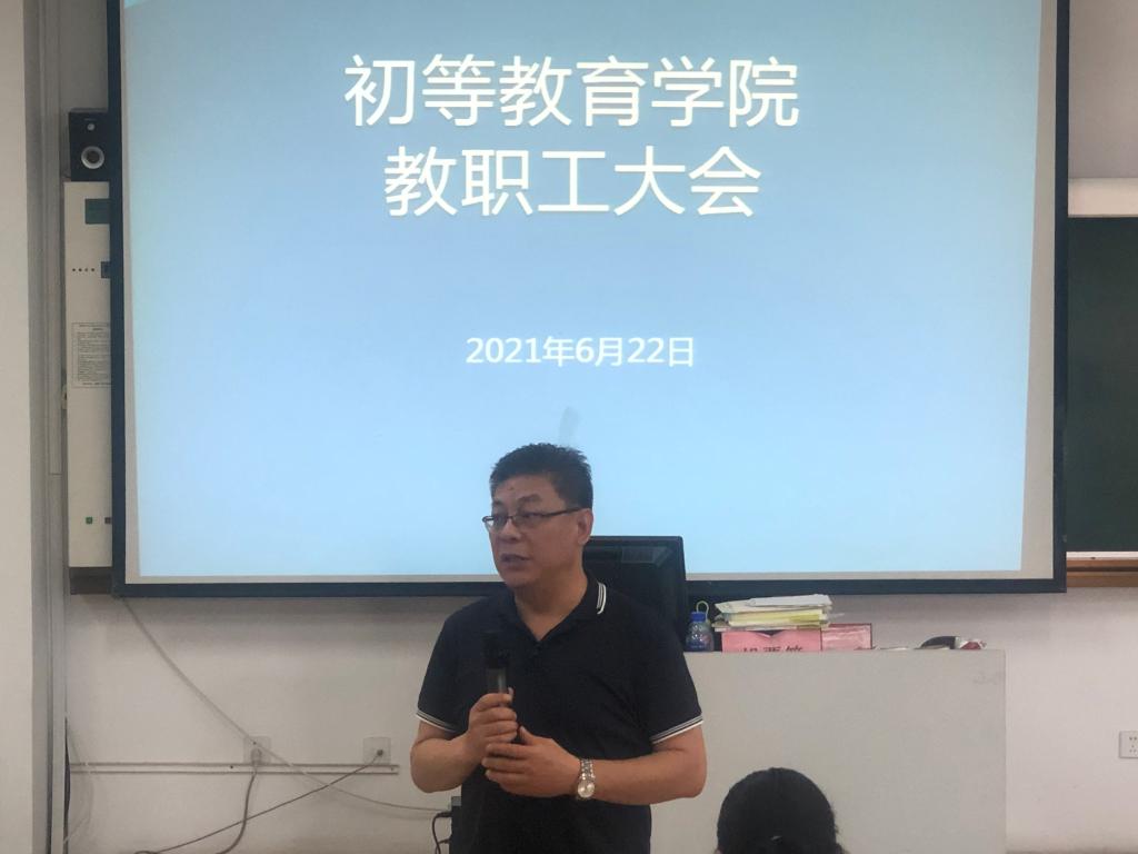 6月22日上午,初等教育学院在阶梯教室五召开了全体教职工大会,就2020年度考核、师德专题教育、期末安全防控等工作进行动员与部署。会议由学院负责人范立栎主持,全体教职工参加了会议。
