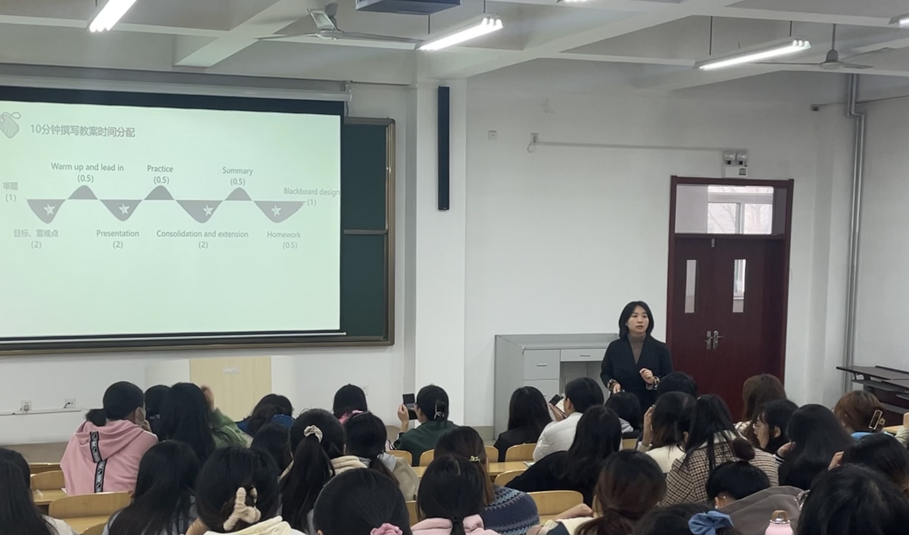 11月4日下午15:50-17:30,初等教育学院英语教研室关于小学英语教师资格认定面试的培训讲座于第五阶梯教室顺利举行。本次主讲人为英语教研室主攻小学英语教法的朱莹老师,英语教育专业2019级1-3班及2019级小学教育专业选修英语模块的学生参加本次讲座。