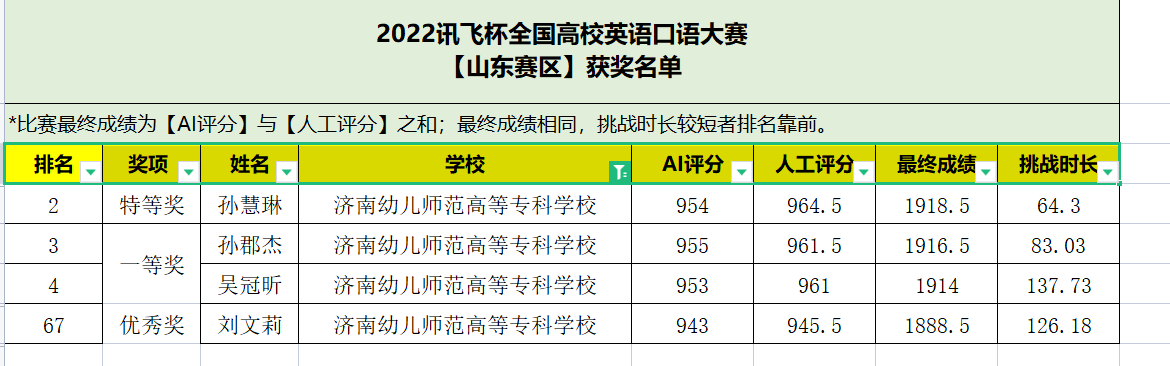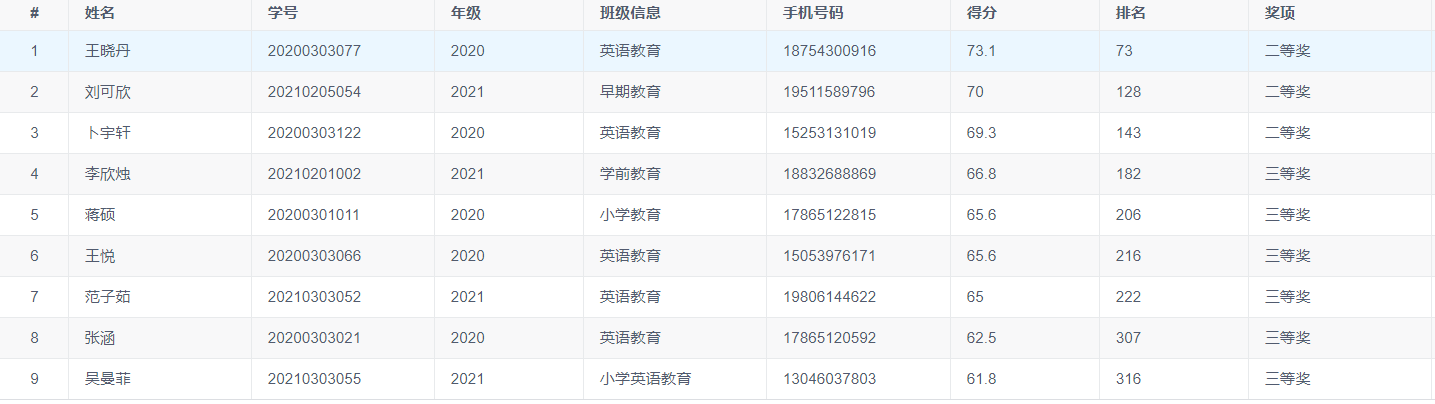 近日,初等教育学院英语教研室组织学生参加的第二届“外教社• 词达人杯”全国大学生英语词汇能力大赛山东分赛区省赛和2022“讯飞杯”全国高校英语口语大赛两项比赛均取得优异成绩。在“外教社• 词达人杯”全国大学生英语词汇能力大赛比赛中,我校学生获得省级二等奖3名,三等奖6名的好成绩;在“讯飞杯”全国高校英语口语大赛中,我校学生和山东省一万多名大学生同台竞技,有4人进入前100名,取得1人特等奖,2人一等奖,1人优秀奖的优异成绩,前三名同学将代表山东省参加全国大赛。成绩的取得离不开领导们的鼎力支持,老师们的辛苦付出,学生们的刻苦努力。在今后的工作中,我们会再接再厉,在学校学院领导下再创辉煌。