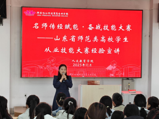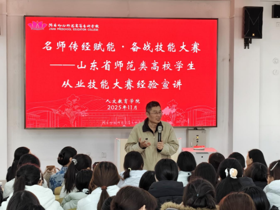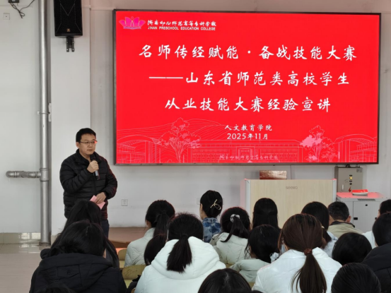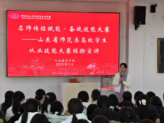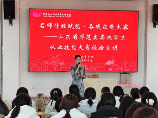 为全力支持新一届山东省师范类高校学生从业技能大赛的备赛工作,激发院学生参赛热情,切实提升师范生实践能力与参赛竞争力,营造积极备赛、以赛促学的良好氛围,11月18日,我院在阶梯三教室隆重举办“名师传经赋能,备战技能大赛”主题宣讲会。活动由副院长仲维义主持,诚邀往届大赛成绩优异的武丹、徐家芳返校分享,大赛优秀指导教师林志芳、李奎艳、李平、孟宪珍等亲临指导,小教、英教专业全体学生参会。