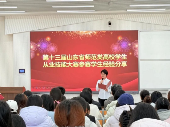 刘贝贝同学结合自身参赛经历,从备赛技巧、心态调整、技能提升等方面分享了师范类高校学生从业技能大赛经验和成长,为学弟学妹们点亮了专业成长的明灯。
