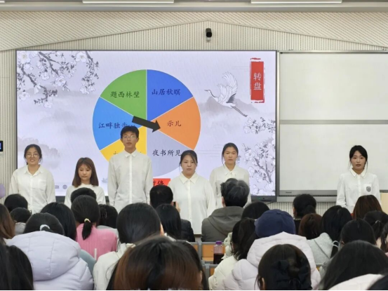 经典吟诵展示,辅导员们创新性地利用转盘,随机选取了两首诗进行吟诵,这是对专业的自信,也是对优秀传统文化的传承。