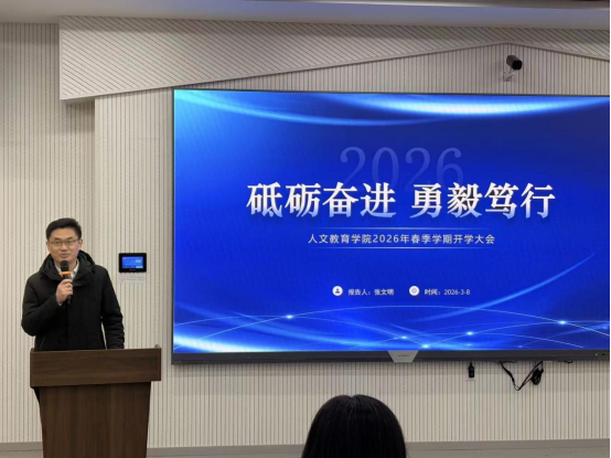 会上,院长张文明以“砥砺奋进,勇毅笃行”为题,对2026年学院工作规划进行全面解读。他首先用“更名、更新、更生”三个关键词回顾了2025年学院重点工作,梳理了发展中存在的问题与不足。面对新形势下的变革与挑战,张文明从机制建设、专业建设、课程建设、教师培养、学生发展、社会服务等方面提出具体应对举措。他强调,全体教师要坚守师德师风底线,强化安全防控意识,以实干精神绘就学院发展新蓝图,推动学院高质量发展。