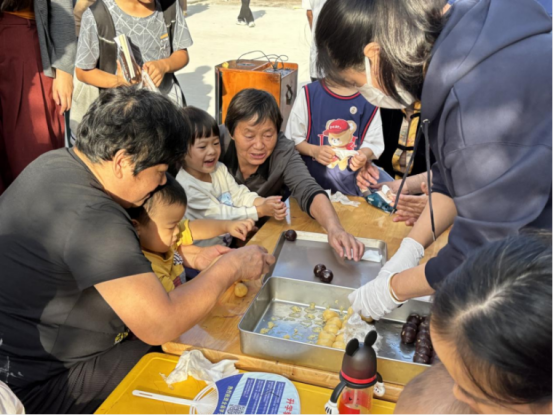最引人入胜的环节当属“沉浸式月饼制作”。在面点师傅的指导下,志愿者与社区居民结对合作,从和面、包馅到压模成型,亲手制作象征团圆的中秋月饼。大家一边交流制作技巧,一边分享节日故事,在劳动与合作中深刻体会了传统美食的文化内涵,感受到了“邻里一家亲”的温暖情谊。