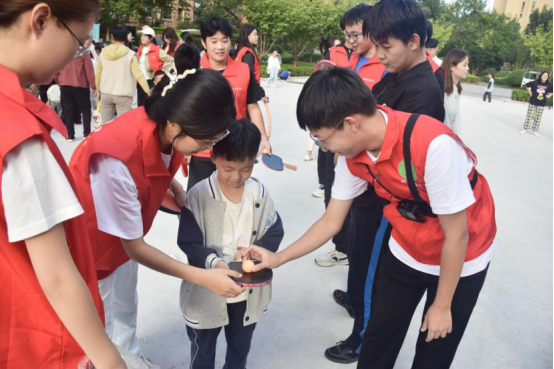 活动当天,社区广场上洋溢着喜庆祥和的节日氛围。游园会设置了形式多样、趣味横生的互动游戏环节。在“趣味套圈”场地,志愿者精心布置奖品,引导居民们有序参与,欢声笑语不绝于耳;“钻呼啦圈”比赛则考验着参与者的身体协调性,孩子们争前恐后,乐在其中;乒乓球台前,老少同台竞技,切磋球技,展现出蓬勃的朝气。志愿者们穿梭于各个活动点,负责活动组织、规则讲解和秩序维护,他们热情周到的服务成为了游园会上一道亮丽的风景线。