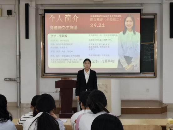 为加强基层生骨干梯队建设,提升学生组织服务效能,9月25日、9月26日,我院学生自律委员会、学生会、团总支换届竞选大会于阶梯教室相继召开。学工办主任董倩,辅导员聂志洁及各组织全体成员、竞选候选人参加此次会议。