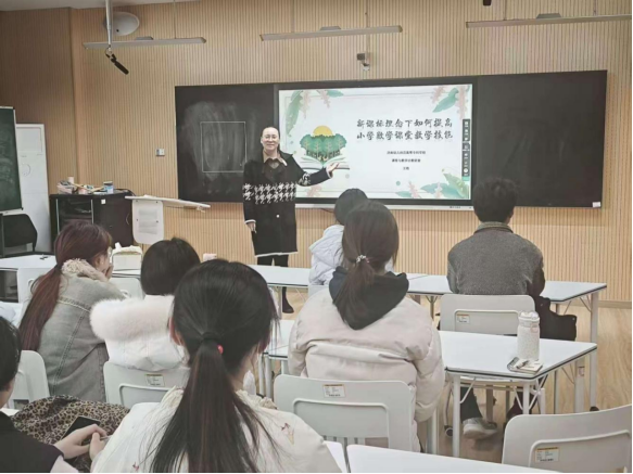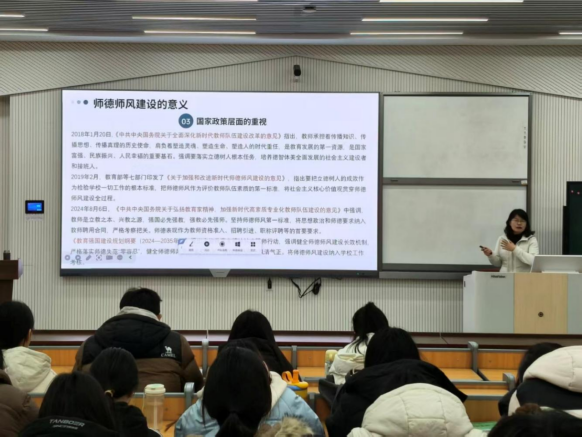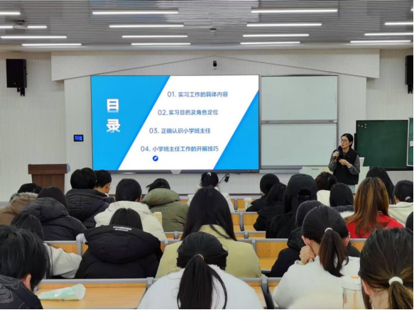 张干红老师与潘建飞老师从不同角度分别为实习生开展专题培训。张干红开展师德师风专题讲座,阐释师德核心内涵与时代意义,围绕教师职业道德规范系统讲解,引导师范生坚守行为准则、筑牢师德根基、树立正确教育观念,为投身教育事业夯实思想基础。潘建飞主讲小学班主任工作实践智慧讲座,梳理实习与班主任工作核心内容,明确实践要求,讲解班主任工作技巧与沟通方法,助力师范生提升综合能力,为今后从教做好充分准备。