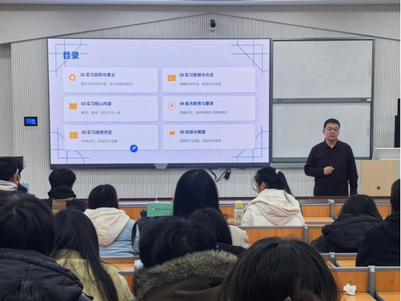 副院长仲维义围绕实习方案与时间安排进行详细解读,明确实习整体部署与相关要求;学工办主任董倩则重点围绕实习期间的安全纪律、考勤管理等内容展开强调,进一步强化同学们的安全意识与纪律观念,全力保障实习工作平稳有序开展。
