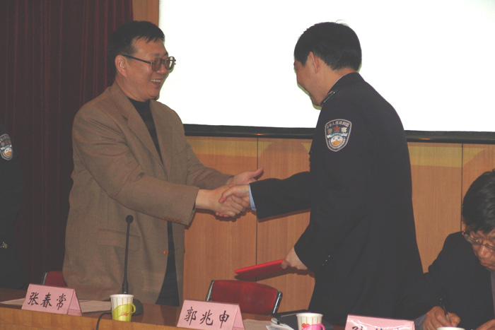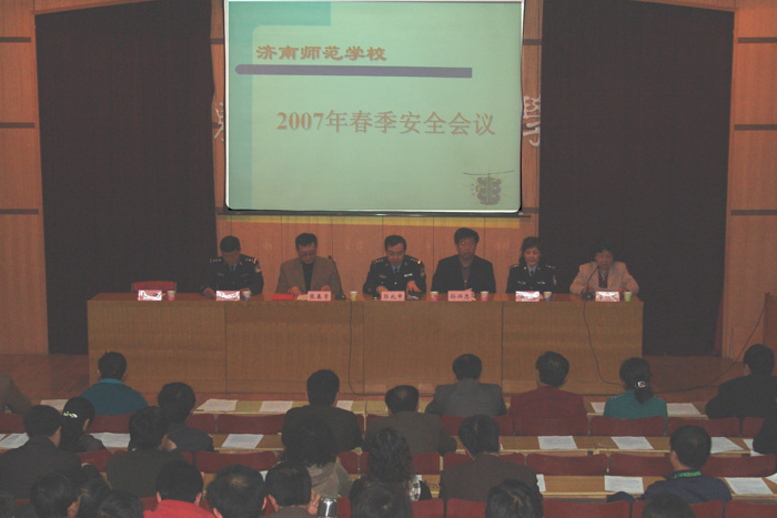 近日,我校召开了2007年春季安全工作会议,学校各科室负责人、班主任、学校安全员、重点岗位负责人参加了会议,驻地派出所的负责同志也应邀参加了会议。学校张校长颁发了聘任工人新村北村派出所所长为学校法制副校长的聘书,驻地派出所的同志介绍了辖区的治安形式。