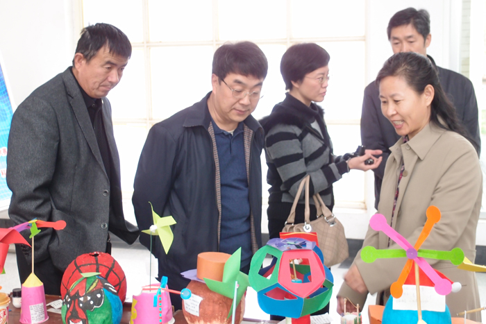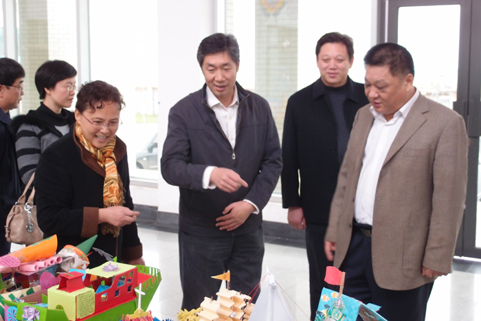 学校高斌书记陪同科协领导参观了我校第三届科技文化节“体验科技、放飞梦想” 主题作品展,领导们逐一参观了学生的作品,对学生的制作工艺和创意给予了赞赏。