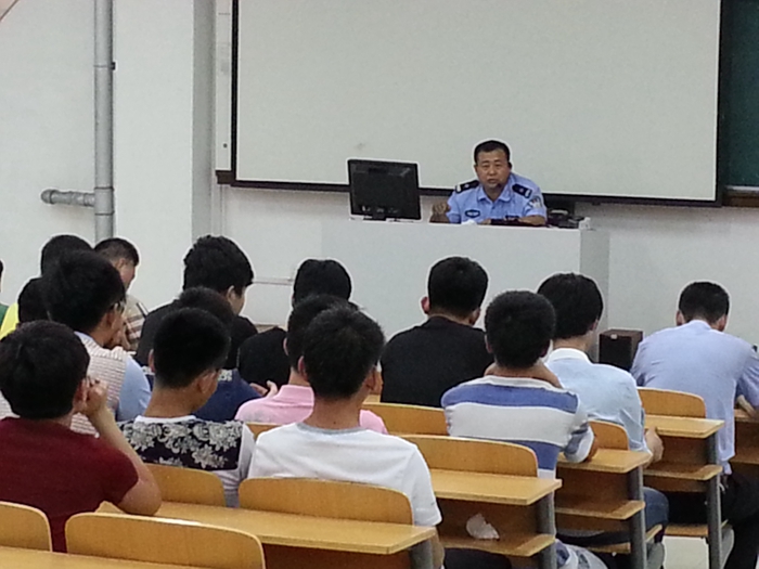 6月10日中午,结合今年“安全教育月”主题活动,安全保卫处和学生工作处邀请了大学路派出所治安民警王洪峰警官,为我校全体男生上了一堂法制教育课。
