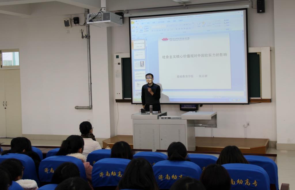 根据学校党委关于组织广大师生培育和践行社会主义核心价值观教育的统一安排和要求,12月4日,职业教育学院有幸邀请到基础教育学院社会科学教研室的张启群老师为2013级会计班的学生举行了题为“社会主义核心价值观对中国软实力的影响”的精彩讲座。