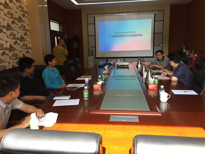 为加快推进学校信息化,加快我校无线校园网络建设,5月20日,在明湖校区会议室召开了济南幼高专无线校园网络合作共建谈判会。丁家德副校长、两位校外专家评委、网络学院院长王新程、学校信息化技术组全体成员、监察室王运田主任、法律审查组罗怡老师等参加了本次会议。会议由王新程院长主持。