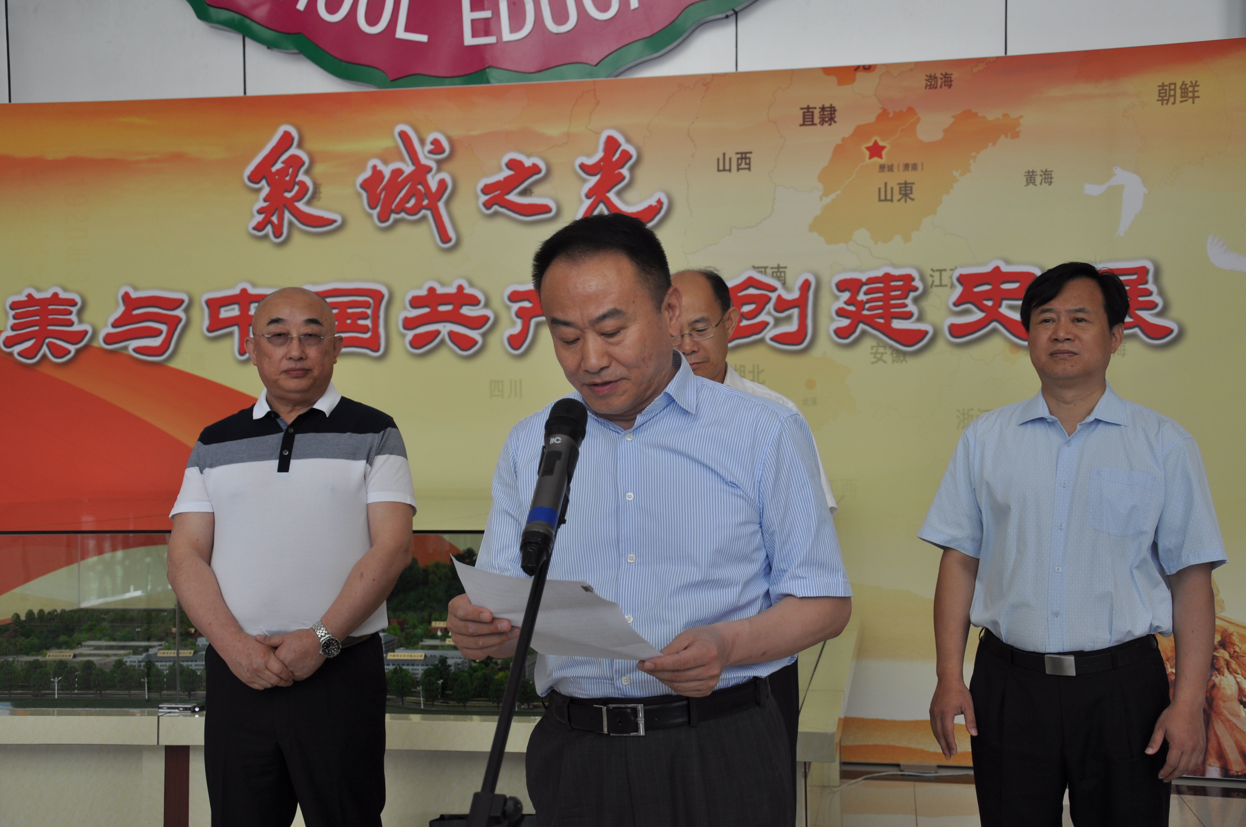 6月28日上午, 在中国共产党成立95周年即将到来之际,我校举行了“泉城之光——王尽美与中国共产党创建史展”开馆仪式。市委常委、宣传部长谭延伟、王尽美先烈的亲属王军先生、山东省委党史研究室原副主任丁龙嘉、长清区区委书记王京文等领导参加了开馆仪式。仪式由济南市教育局党委书记、局长陈东生主持。