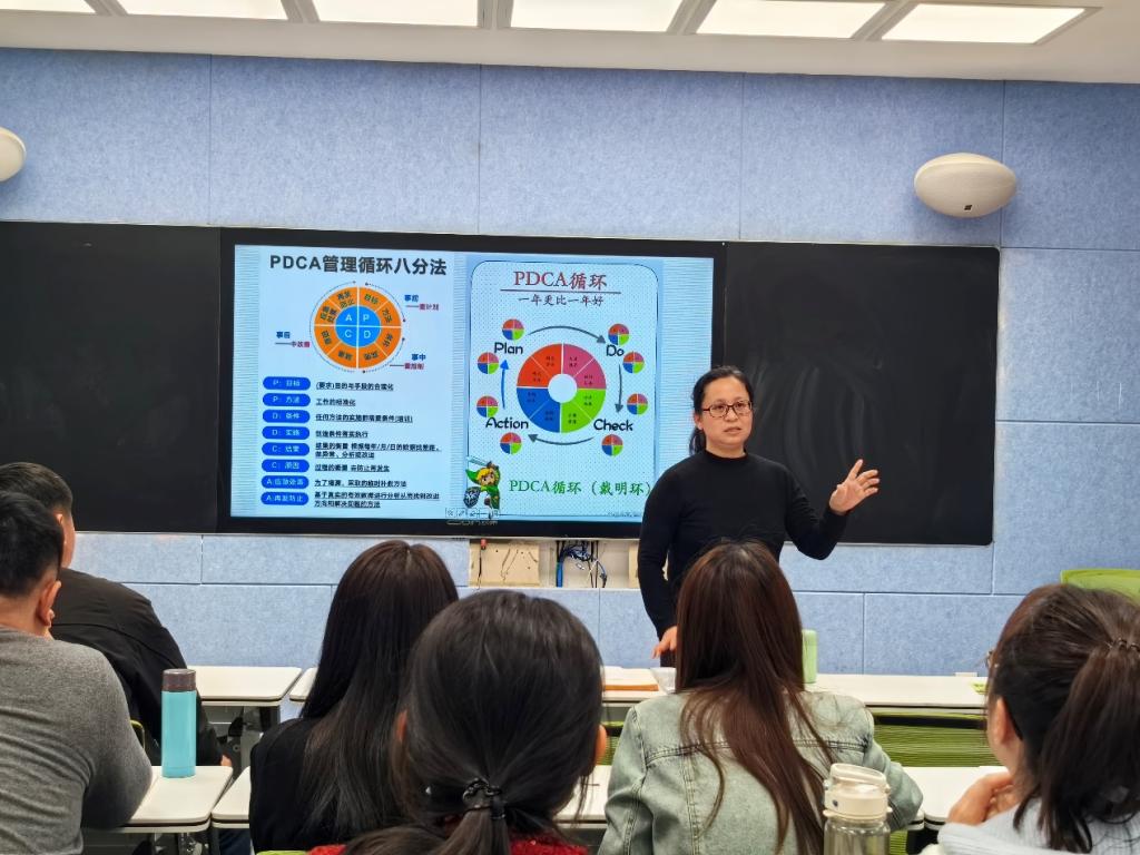 赵院长首先强调了职称评聘在教师职业发展中的重要作用,职称评聘不仅是教师专业能力的体现,更是学院教育教学质量提升的重要保障。她通过详细解读学校职称考核标准,结合自身丰富的教育教学经验,为老师们提供了宝贵的职业规划建议。院长强调,教师应明确自己的职业目标,制定切实可行的职业规划,以适应教育发展的新要求。建议老师们把PDCA循环管理理念融入日常教学科研工作中,实现“计划-执行-检查-改进”的闭环管理,推动自身能力持续提升。