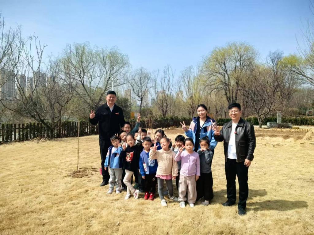 活动现场,党员与孩子们“大手牵小手”结对协作,挥锹培土、扶苗浇水,共同栽下梨树30余株、布鲁斯克樱桃树20余株,柿子树2株,每棵树苗均悬挂“童心认养牌”,由结对家庭长期管护。孩子们还通过绘制“绿色梦想”画作、聆听树木知识讲解,在劳动中感悟生态保护的意义,以‘党建红’守护‘生态绿’,共建绿色家园。”