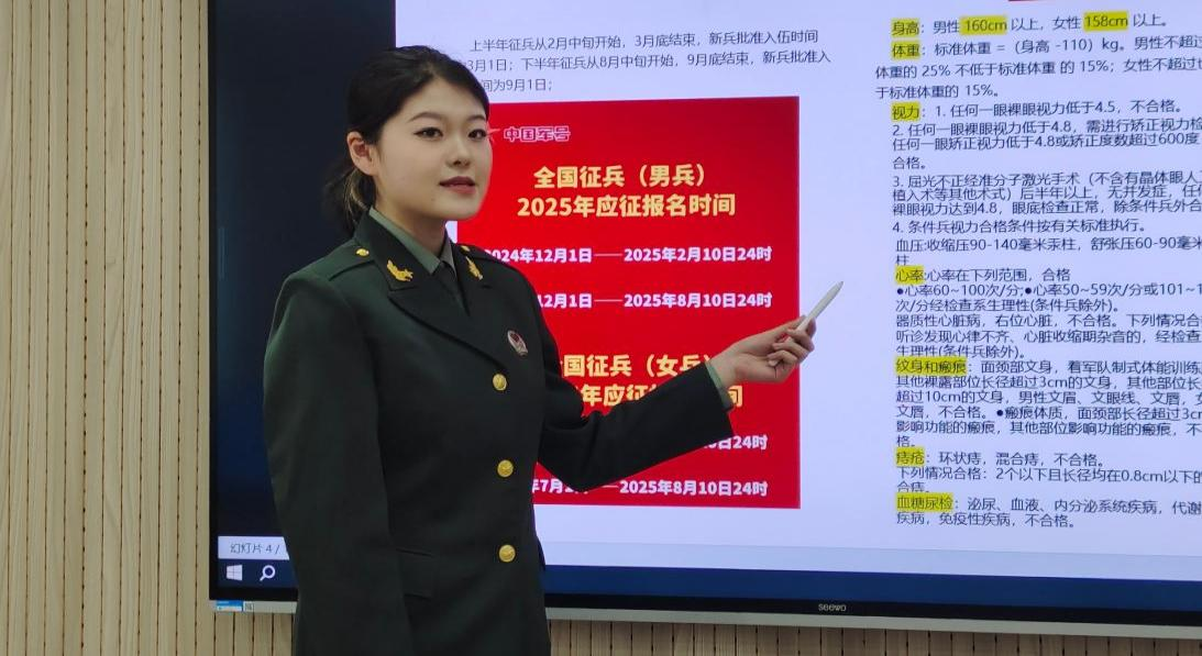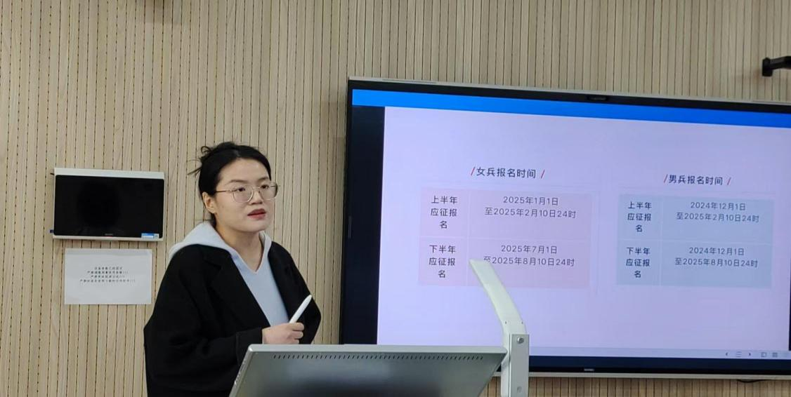 汪洋老师立足学院实际,结合最新政策,详细解析了大学生入伍的报名流程、时间节点、材料准备及优待政策,并深入阐释参军对个人成长的深远意义。针对学生关注的“学业衔接”“退伍复学”等问题,她逐一解答,并鼓励学生将个人理想融入强国强军事业:“参军不仅是义务,更是锤炼品格、实现价值的宝贵机遇。”