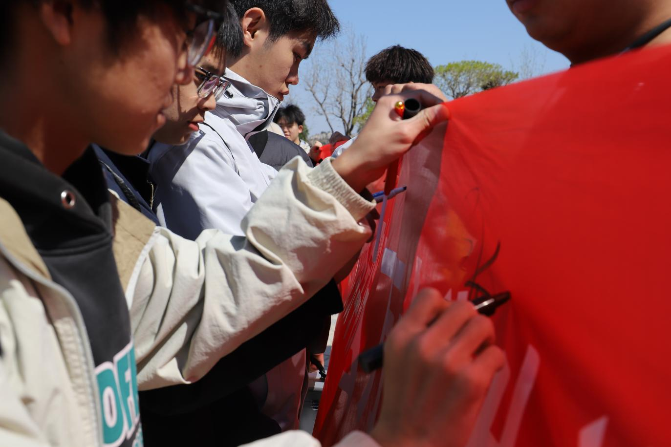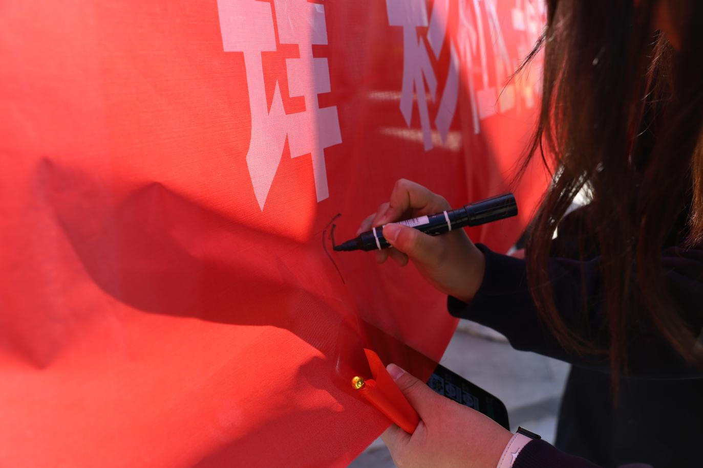 当志愿者们历经艰辛,成功登顶,山顶清风拂面,视野辽阔。在鲜艳的横幅前,全体志愿者怀着无比的庄重与使命感,纷纷在“‘锋’彩社区,志愿同行”的条幅上郑重签上自己的名字。每一个签名,都承载着一份对志愿服务的郑重承诺,每一个签名,都是对青年担当的生动诠释。