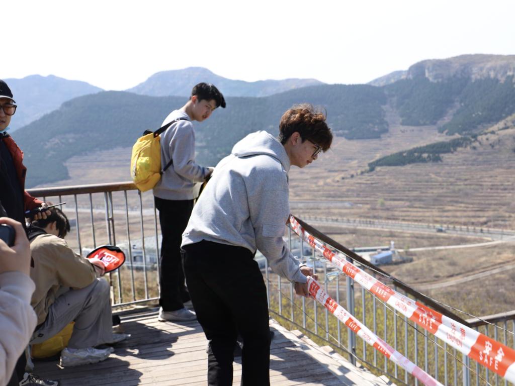 在登山道路的陡峭与危险区域,志愿者们充分发挥先锋模范作用,迅速行动起来。他们两人一组,一人手持安全警示条,一人寻找合适的固定点,将警示条沿着危险区域的边缘小心拉设,还向过往的登山者耐心宣传登山安全知识,为登山者筑起一道坚固的安全屏障,确保每一位登山者的人身安全,增强了登山者的安全意识。