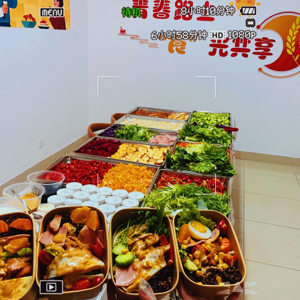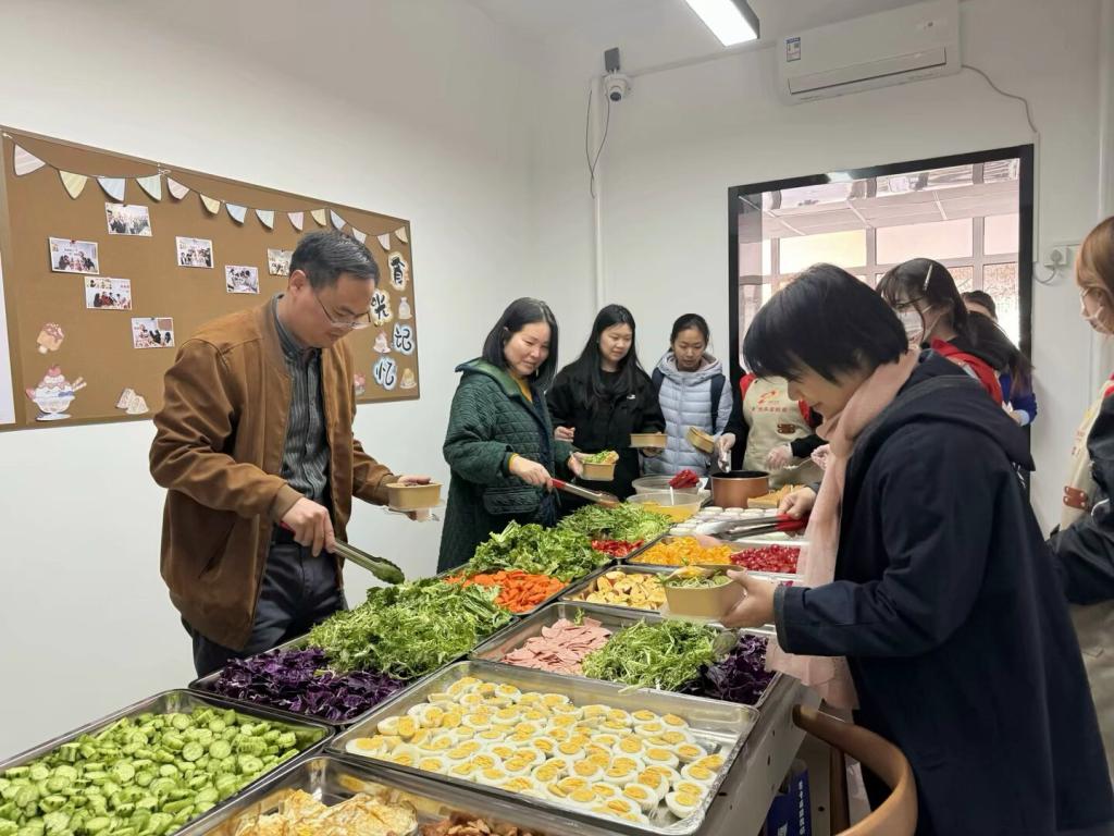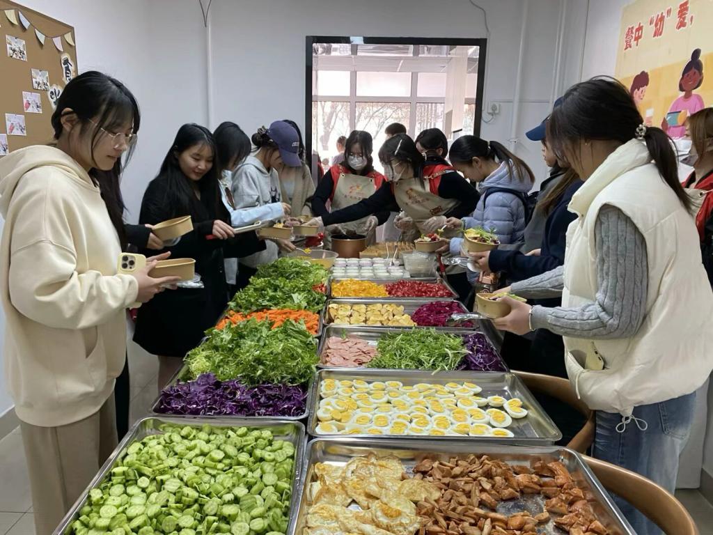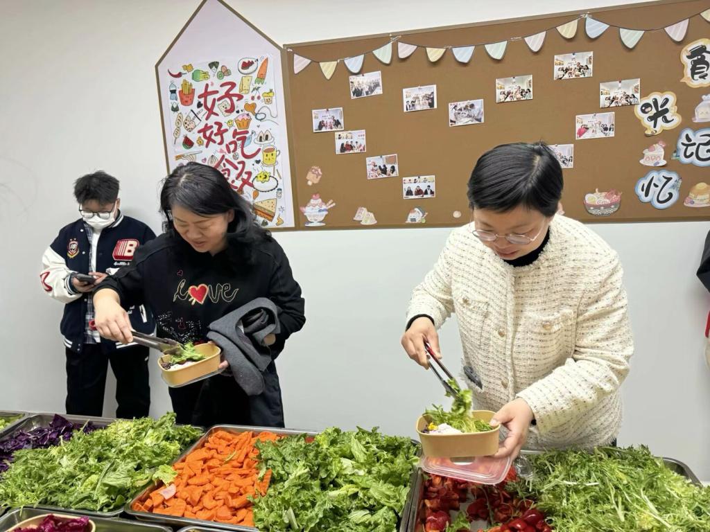 在师生协作下,一份份“彩虹碗”渐次成型——底层果绿色的蔬菜包裹,中层鸡胸肉与玉米粒、鸡蛋交织出蛋白质网络,顶层各类水果摆出艺术造型。参与师生根据食谱供销科普卡,制作属于自己独一无二的“负卡路里沙拉”,清新味蕾又促进代谢。
