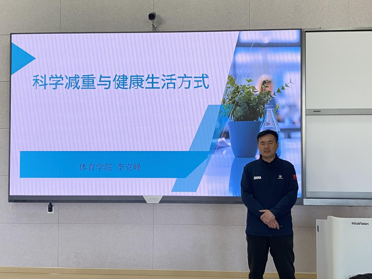 为提高师生对健康体重的重视,普及科学减重知识与健康生活方式,4月14日,体育学院举办“科学减重与健康生活方式”讲座。本次讲座隶属于校工会与体育学院携手主办的“科学减脂,健康通行”活动月系列活动中的其中一环。此次讲座由体育学院副院长李克峰担任主讲人,校工会主席呼庆伟、体育学院班子成员以及部分师生代表共同参与。