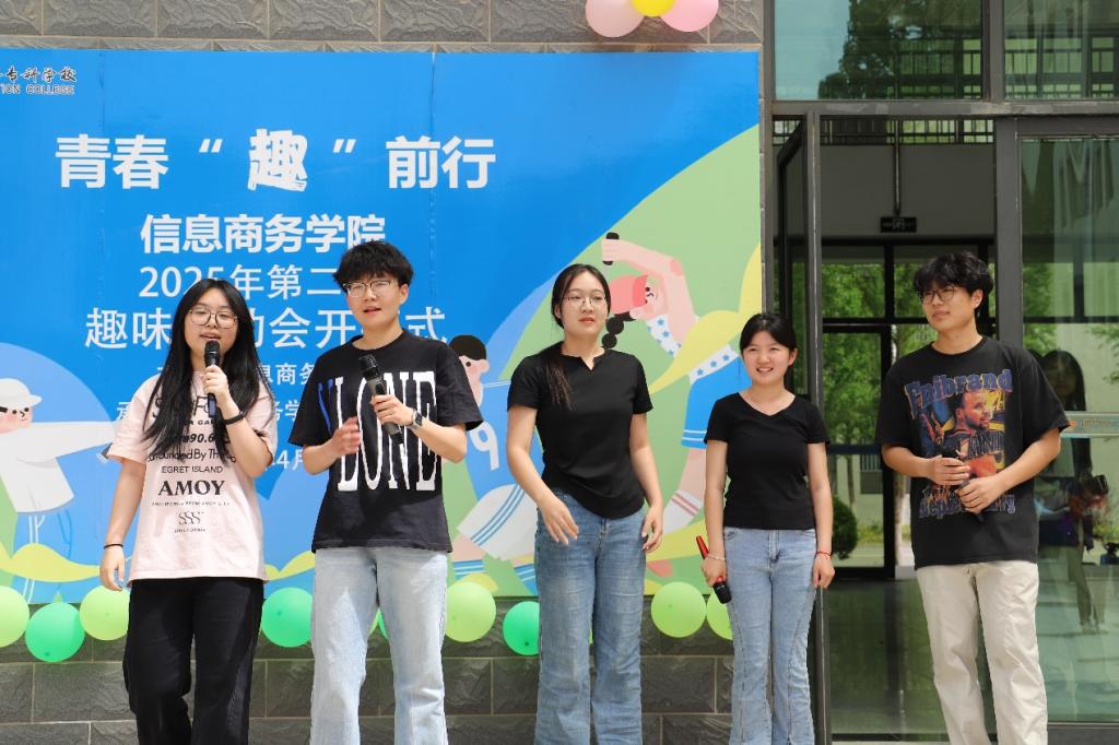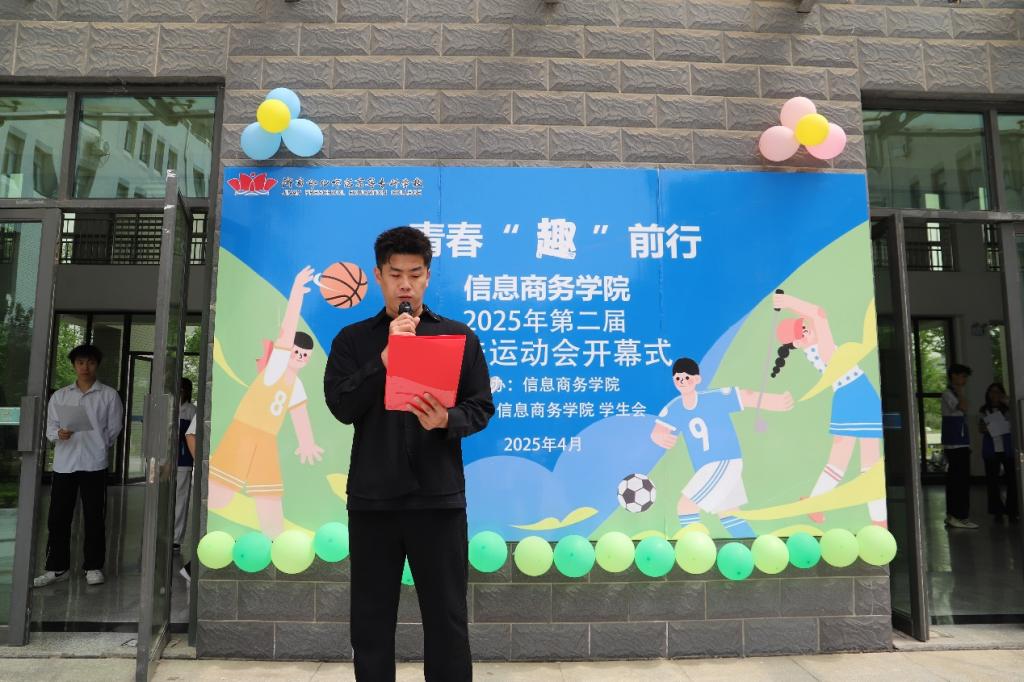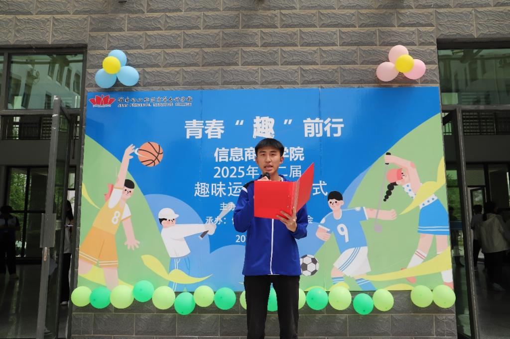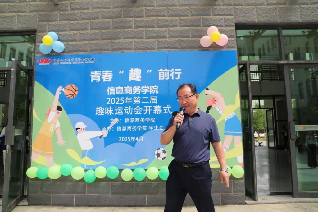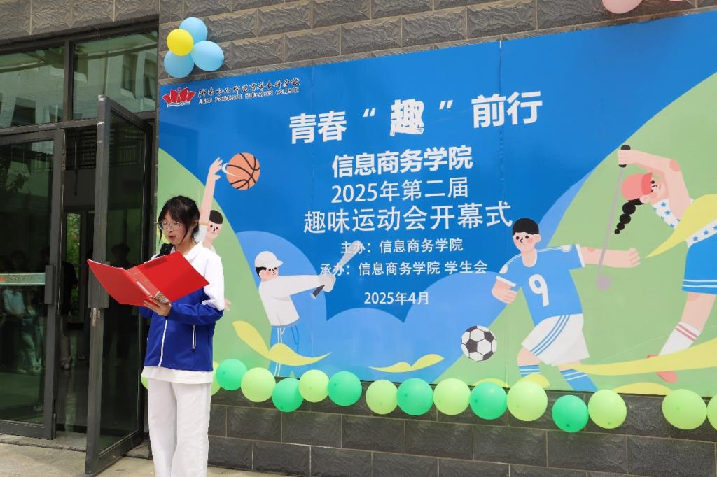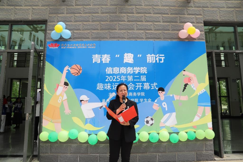 开幕式上,信息商务学院院长赵红艳发表致辞,对开幕式的顺利举办表示祝贺,并向全体参与人员致以诚挚问候,着重强调学院对学生身心健康的重视,倡导学生积极拥抱阳光健康的生活方式。郭宇宸老师介绍,本次运动会项目以兼具竞技性与趣味性的集体项目为主,十分考验团队协作等能力,鼓励同学们在参与中享受探索、协作与策略运用的乐趣。裁判员代表和参赛运动员代表先后发言,强调安全与规则的重要性,期望大家在比赛中尽情释放激情、传递友谊。随后,党总支书记朱英华宣布2025年春季趣味运动会正式开始。