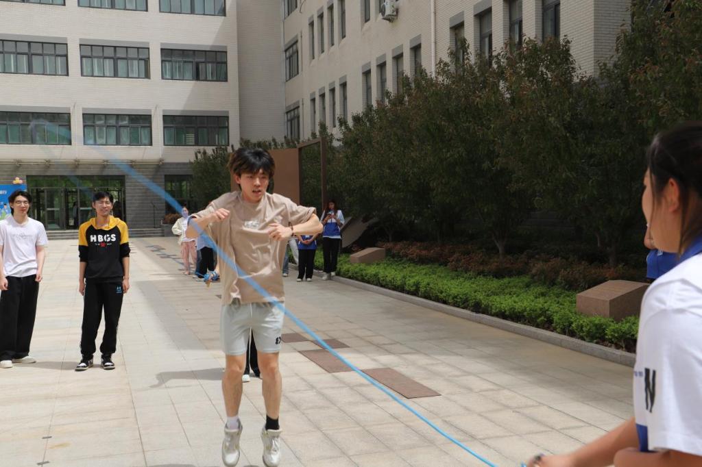 开幕式结束后,跳长绳、“心理解压”等趣味活动有序开展。在跳长绳比赛区域,参赛队员们配合默契,随着长绳的起落轻盈跳跃,节奏明快,展现出高度的团队协作精神;“心理解压”活动现场,运动员腿上绑着五颜六色的气球,随着裁判员的一声令下,运动员在气球的爆破声和嬉戏追逐中释放压力。