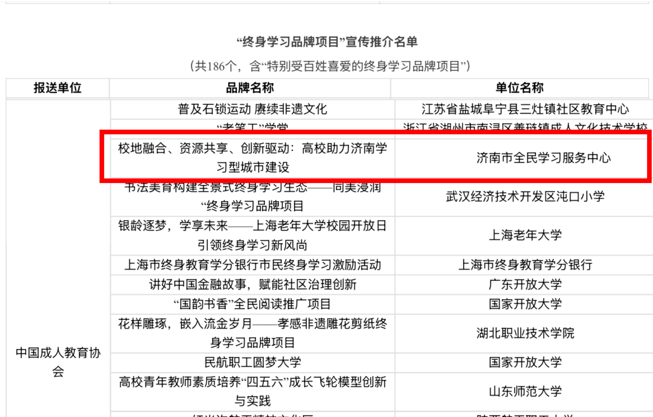 在近日公布的2024年全国终身学习品牌项目评选结果中,由济南幼儿师范高等专科学校(济南市全民学习服务中心)申报的“校地融合、资源共享、创新驱动:高校助力济南学习型城市建设”项目成功入选。值得关注的是,山东省仅有两所高校获此殊荣,除我校外,另一所为山东师范大学。这是我校继2016年“泉学e站”、2020年“泉学汇”之后,第三次斩获这一国家级荣誉,充分彰显了我校在服务全民终身学习领域的持续创新能力和示范引领作用。