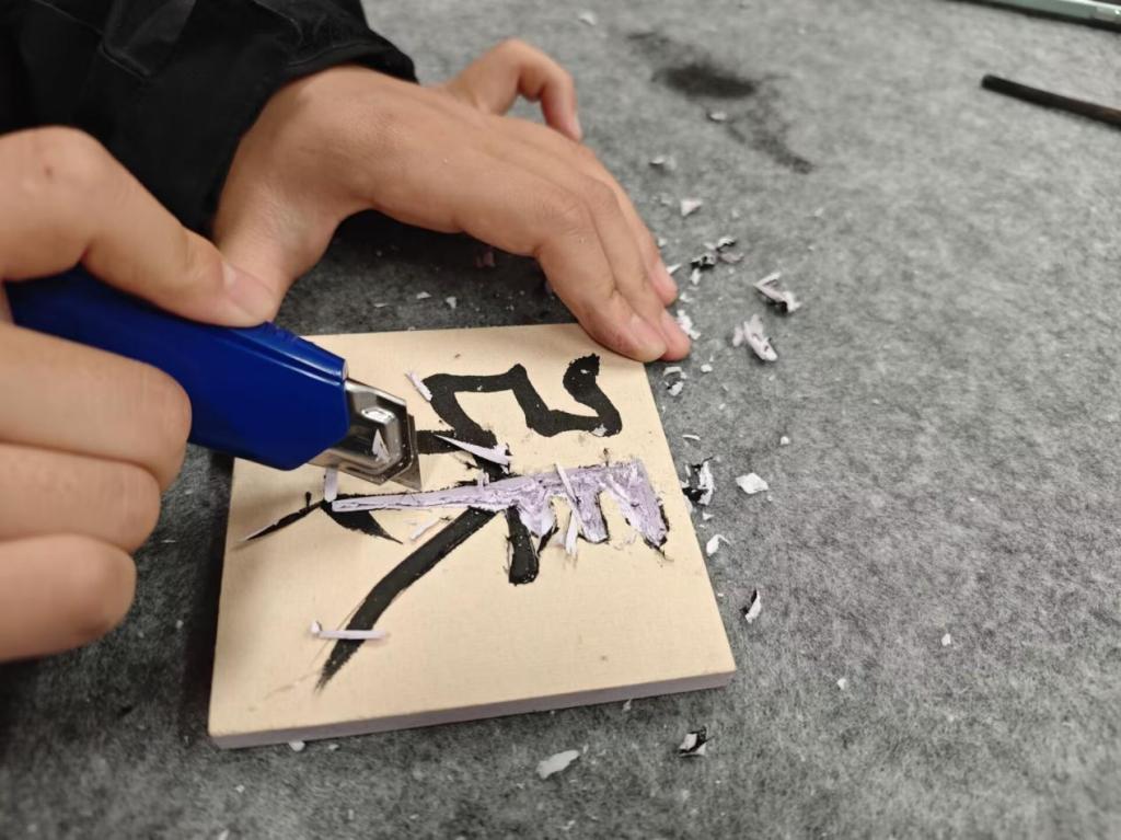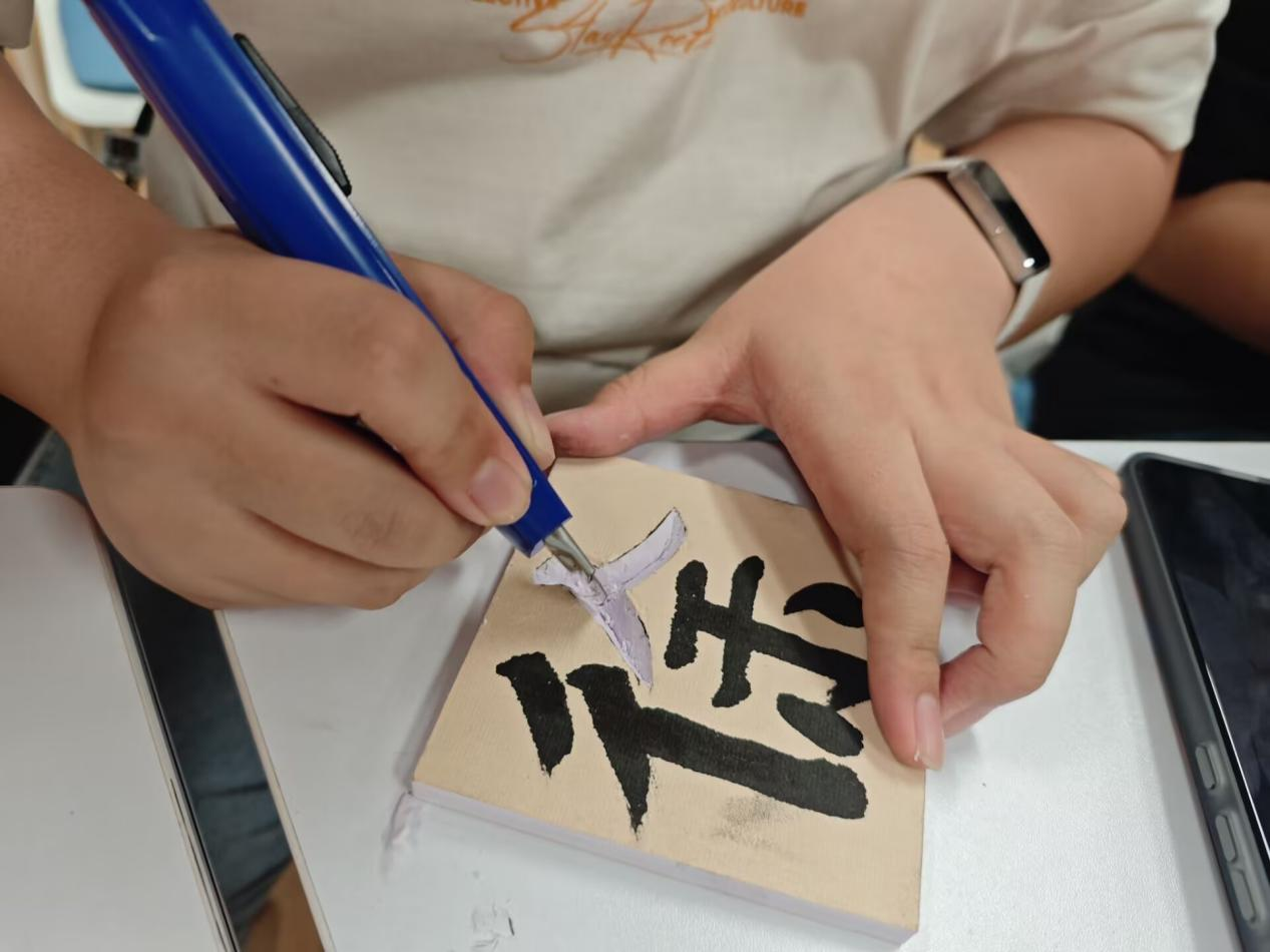 随后进入雕刻环节,董老师示范时,刻刀与纸板碰撞出的粉末如雪花般飘落,那灵动的刀法让同学们屏息凝神。在专注与探索中,现场气氛渐入佳境,同学们沉浸于刻字的过程中,仿佛忘却了生活中的烦恼与压力,全身心地投入到这一传统技艺的体验中,这种专注本身就是一种心理调适的过程,有助于缓解焦虑情绪,提升心理韧性。
