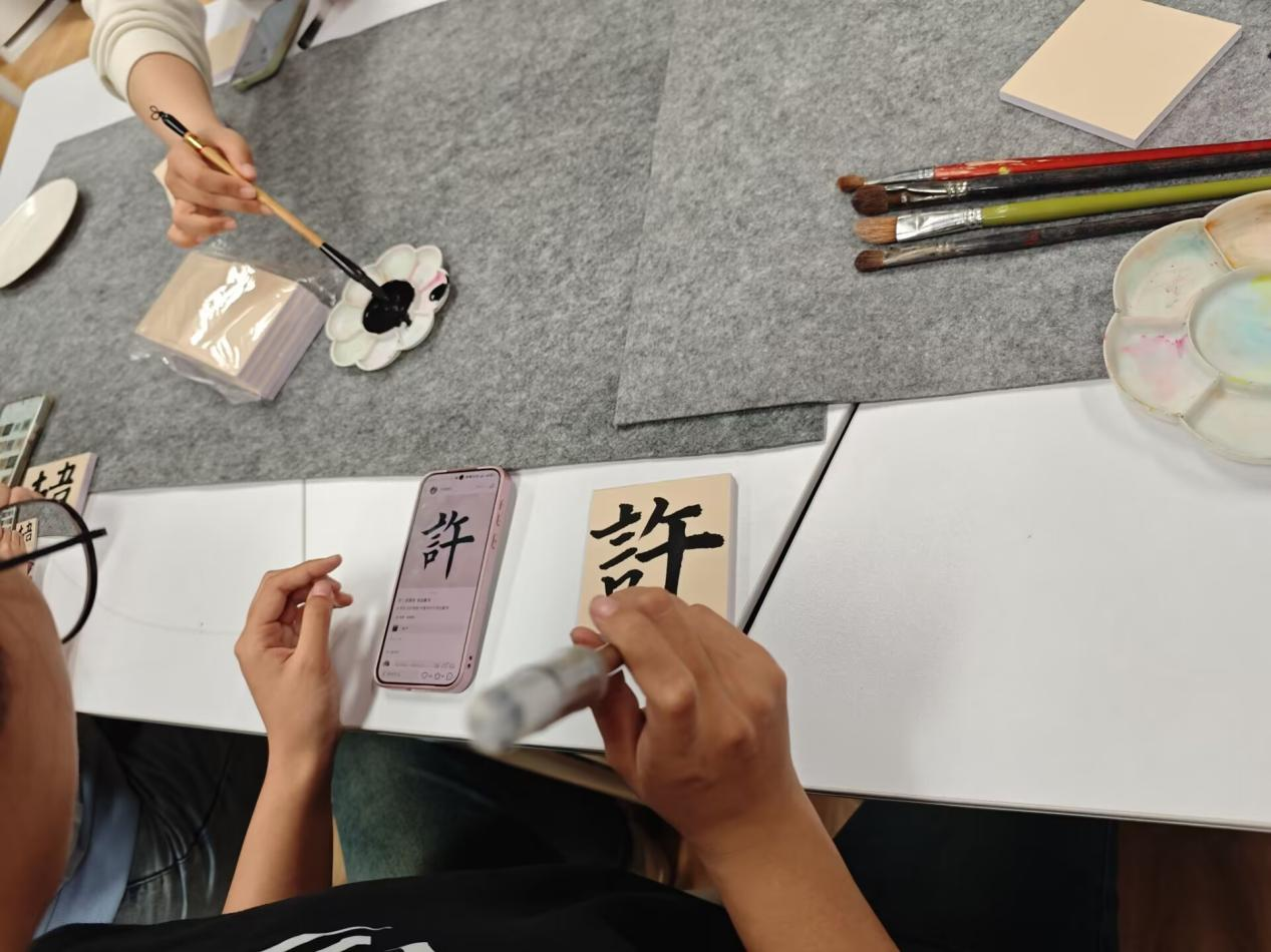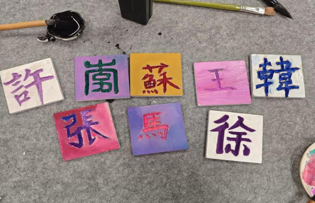 同学们分享了自己名字和姓氏的故事,有的同学讲述了家族长辈取名时的寓意,有的同学则查阅了家族姓氏的历史渊源,通过分享,增进了同学们对姓氏文化的认识。董老师手持方形木板,详细讲解刻字的具体流程,同学们拿起毛笔在纸板上写下自己的姓氏,或是对自己有着特殊意义的姓氏,同学们在书写姓氏的同时,也在探寻着自己与家族的渊源,这一过程仿佛是一场心灵的对话,内心的自豪感与归属感油然而生,为心理健康注入了温暖的底色。