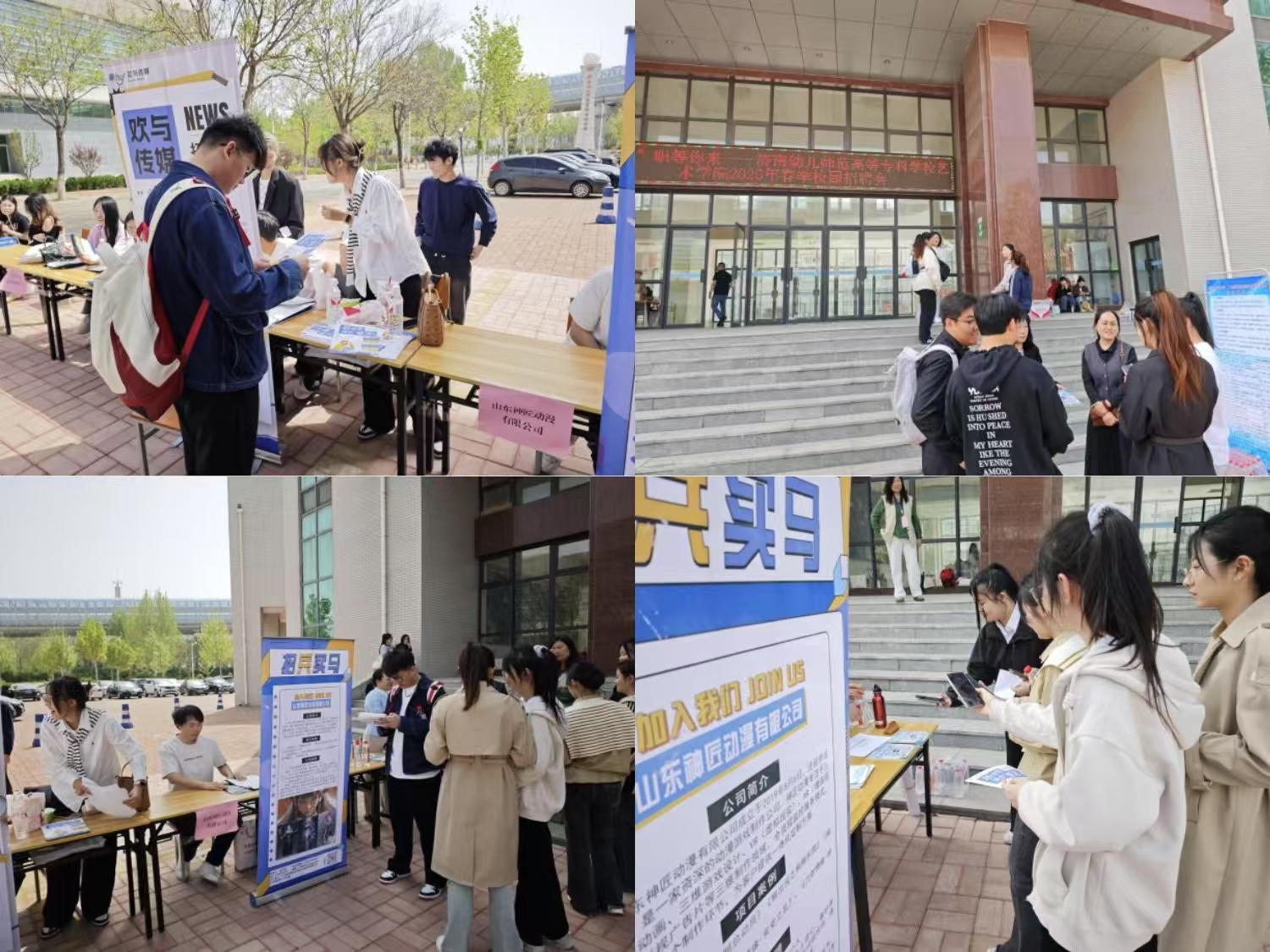 本次招聘会汇聚了山东红巨人影业有限公司、泰山文化艺术培训学校、济南市槐荫区励志文化培训学校、山东学盟教育集团有限公司等十家企业,提供涵盖艺术教育、文化传媒、少儿培训、动漫设计等多领域的优质岗位。企业展台前,同学们积极投递简历,同企业招聘人员沟通交流,展现自身的专业技能。各企业代表也向同学们细心介绍着企业相关信息,从企业的发展历程、核心业务到未来规划,一应俱全,让双方得以迅速了解彼此。