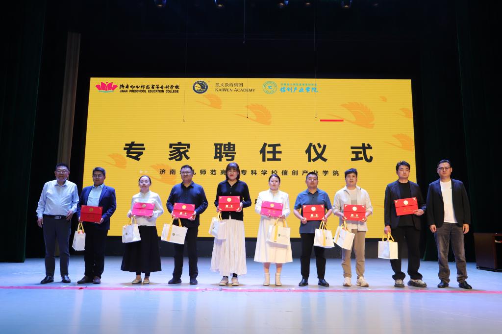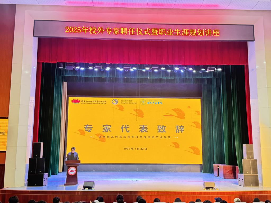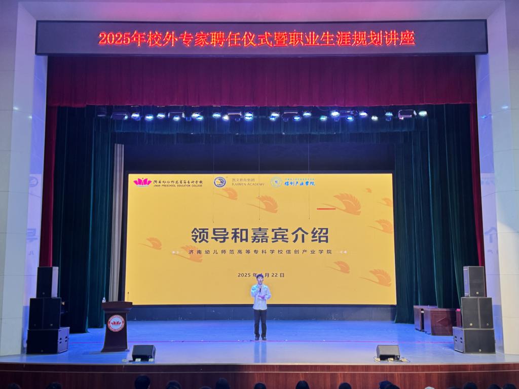 4月22日下午,济南幼儿师范高等专科学校信创产业学院在校尽美演播厅隆重举行校外专家聘任仪式暨职业生涯规划讲座。此次活动以深化产教融合、助力学生职业发展为目标,为学生的职业生涯规划提供专业指导。济南幼儿师范高等专科学校副校长崔建、信息商务学院院长赵红艳、副院长宋济明以及凯文教育集团山东分公司总经理徐功东、项目经理范志霞、运营张绍东、陈红、林文夕等企方代表悉数到场。此外,还有来自不同领域的特邀专家,如山东省电商协会副会长张强、大学生职业规划专委会主任关存敬、山东友棉贸易有限公司管理中心总监李艳、济南易企发财税服务有限公司总经理刘朋飞、山东省技术能手苏放、抖音Ai基地总经理宋勇、凯文教育集团人力资源高级经理王伟、山东兴沃教育科技集团有限公司总经理王莉、南京航空航天大学法学博士祖密密等来自不同领域的企业代表与特邀专家参与活动,现场专业氛围浓厚。