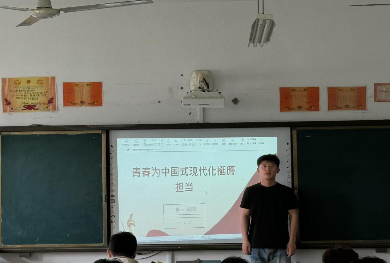 知识讲解环节,各班团支书借助精心制作的PPT,解读相关重要思想,通过深入浅出的分析,让同学们对中国式现代化有了更深刻的认识。还结合本校青年在学科竞赛等方面助力国家发展的实例,激励同学们向榜样学习,积极投身到中国式现代化建设中。