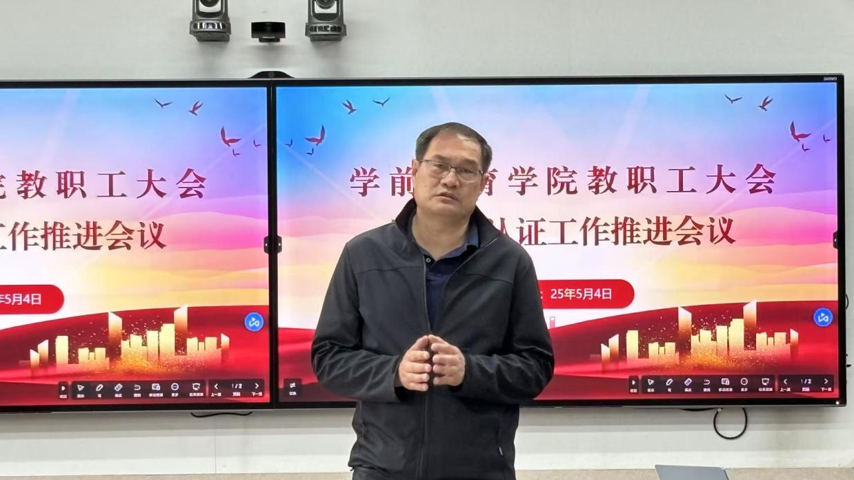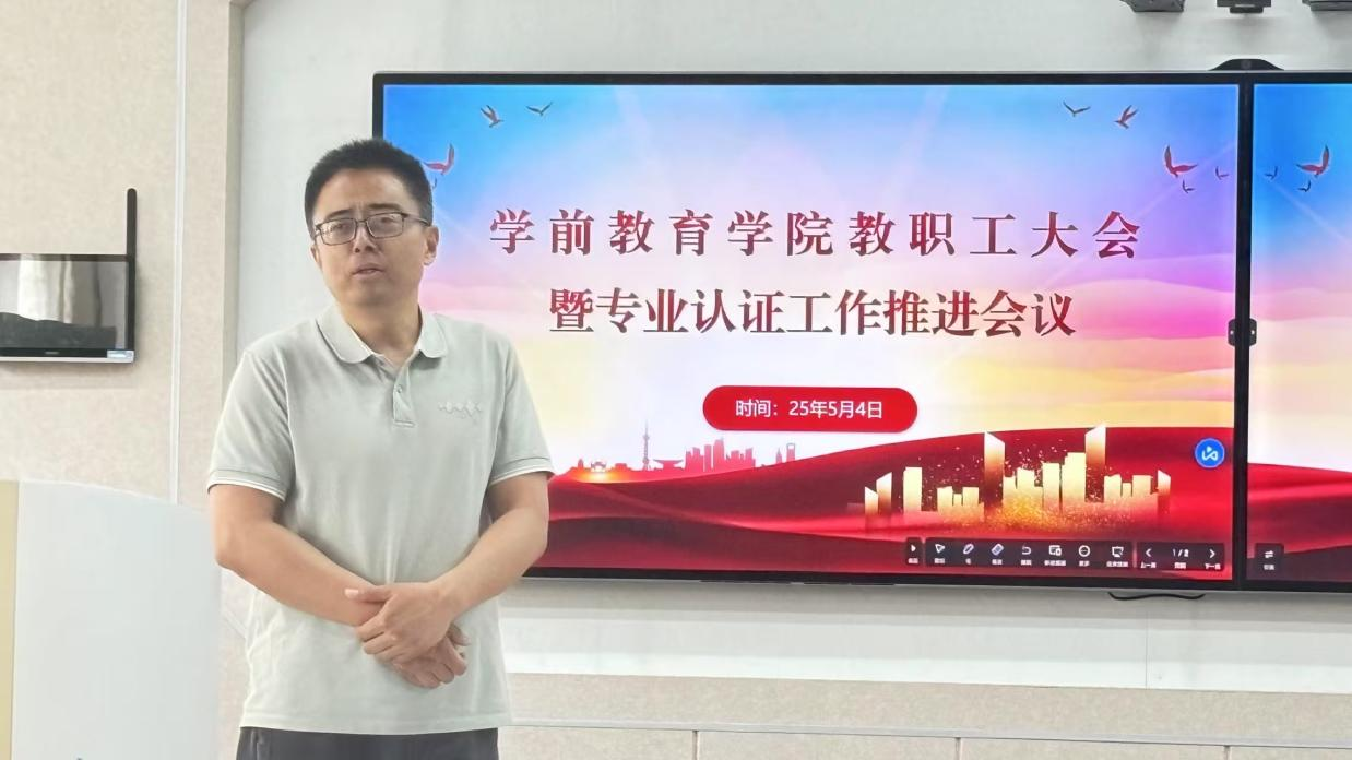 为扎实推进师范专业认证工作,强化教师队伍建设,保障学院教育教学工作平稳有序开展,2025年5月4日,学前教育学院在学前楼301智慧教室召开教职工大会暨专业认证工作推进会议。本次会议由学院党总支书记杨勇主持,学校党委书记李海平莅临指导,学前教育学院全体教职工参会。