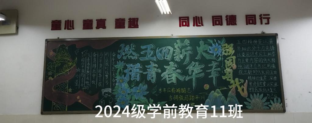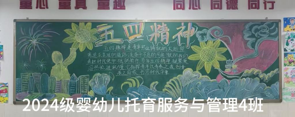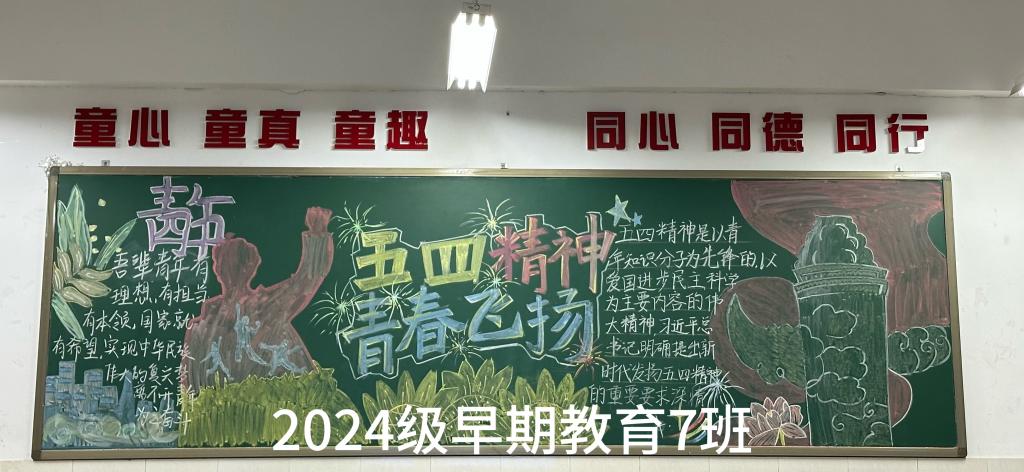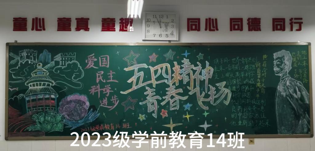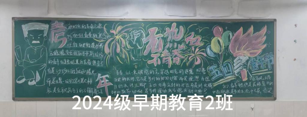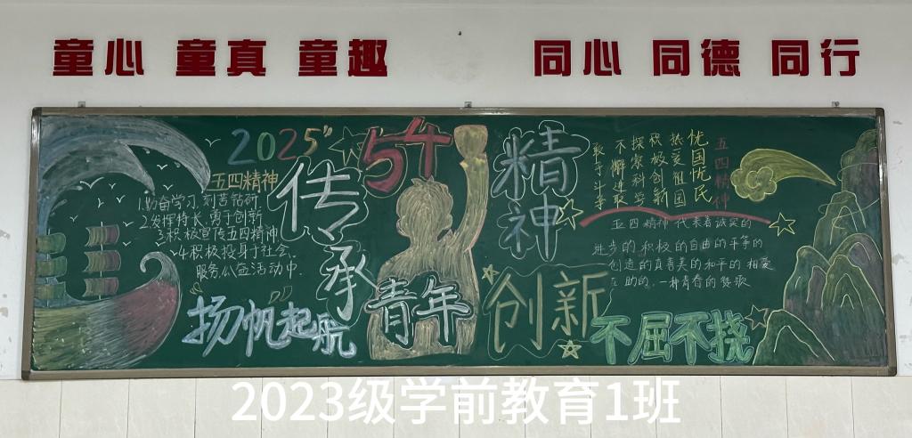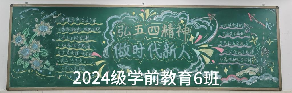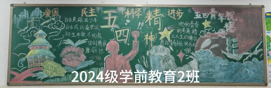 五月鲜花绽放,青春之歌嘹亮。在五四青年节到来之际,为传承“爱国、进步、民主、科学”的五四精神,激励青年学子勇担时代使命,学前教育学院成功举办“五四承宏志,青春启新程”主题黑板报创作活动,同学们以笔为刃,以板为纸,用斑斓色彩勾勒青春理想,用工整文字书写青年使命。