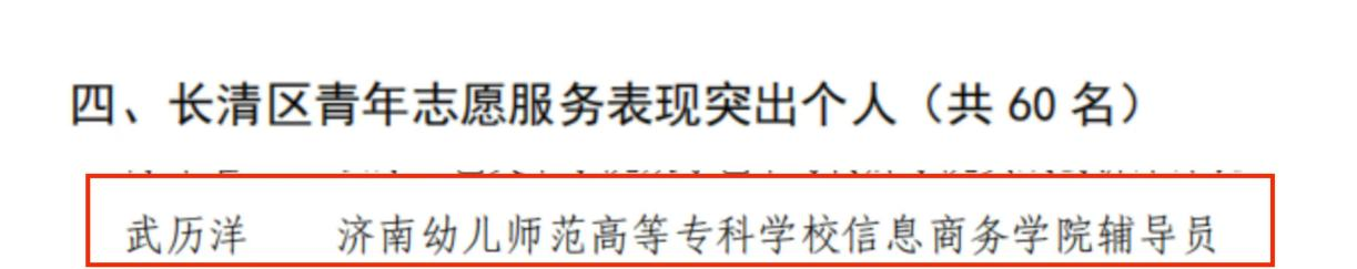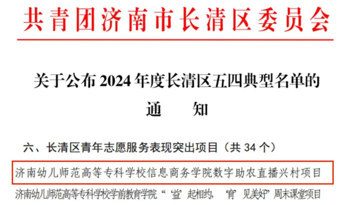 近日,共青团济南市长清区委公布了2024年度长清区五四典型名单。其中信息商务学院数字助农直播兴村项目荣获“长清区青年志愿服务表现突出项目”;信息商务学院辅导员武历洋荣获“长清区青年志愿服务表现突出个人”。