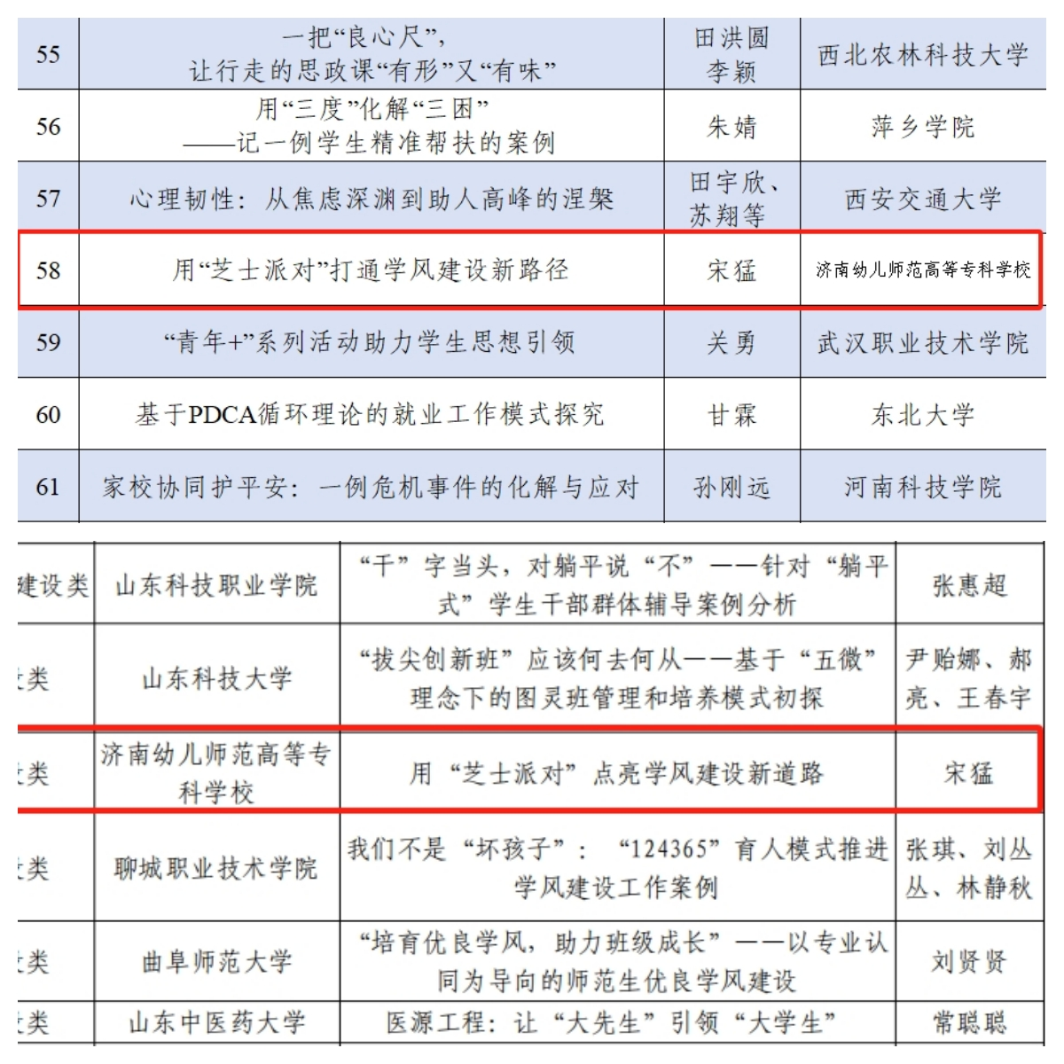 学前教育学院辅导员宋猛近期在两项重要评选活动中接连获奖:在教育部高校思想政治工作队伍培训研修中心(山东大学)与《高校辅导员》编辑部联合开展的2024年高校思想政治工作优秀文章征集活动中,其凭借《用“芝士派对”点亮学风建设新道路》荣获优秀案例奖项,同时在山东省教育厅组织的2024年全省高校辅导员工作创新项目评选中,其《用“芝士派对”打通学风建设新路径》成功斩获三等奖。