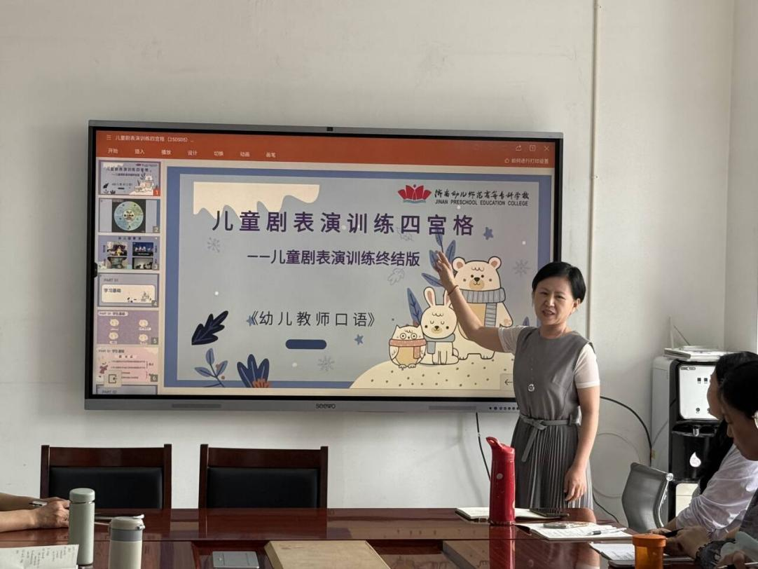 会议亮点当属魏桂秋副教授的课改成果展示。魏桂秋老师就专业认证期间抽取课程《儿童剧表演四宫格》进行经验分享。从教学设计理念、课堂教学展开、教学重难点突破、课程思政融入、岗课赛证结合、双创融入、厚植师德情怀等方面为大家展开讲解,精彩纷呈又蕴含巧思的教学设计赢得了老师们的阵阵掌声,同时也展示了《幼儿教师口语》作为国家级精品课程的质量。