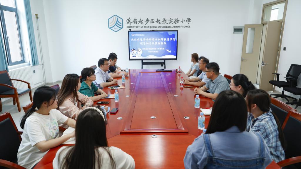 在济南起步区起航实验小学,校长郑国栋热情接待并介绍了学校近期的工作安排与教学特色。仲维义感谢学校为实习学生提供良好的学习生活环境与宝贵的实践机会,强调了实习对学生专业成长和职业发展的重要意义。