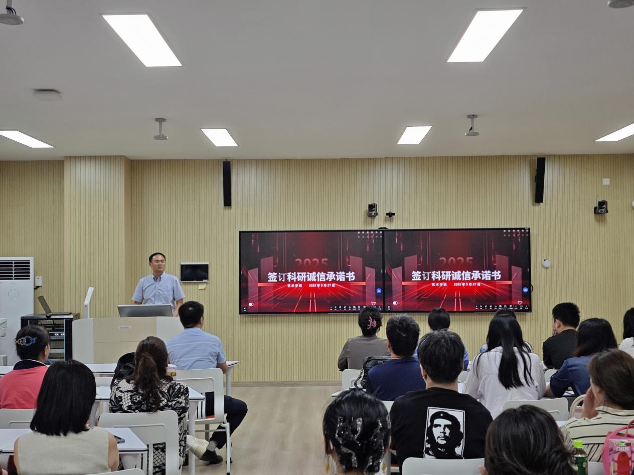 会议伊始,秦宗亮重点强调了科研诚信的重要性。他指出,科研诚信是学术生命的基石,全体教师应以身作则,恪守学术规范,坚决杜绝学术不端行为。会上,全体教师签署了《科研诚信承诺书》,承诺以严谨态度对待科研工作,维护学术尊严。秦宗亮同时鼓励教师聚焦学科前沿,提升科研创新能力,力争在高级别科研项目和学术成果上实现突破。此外,他号召教师积极参与专业赛事,以赛促研,以赛促教,推动教学与科研成果双向转化。