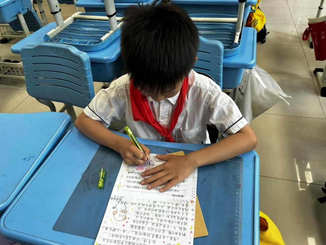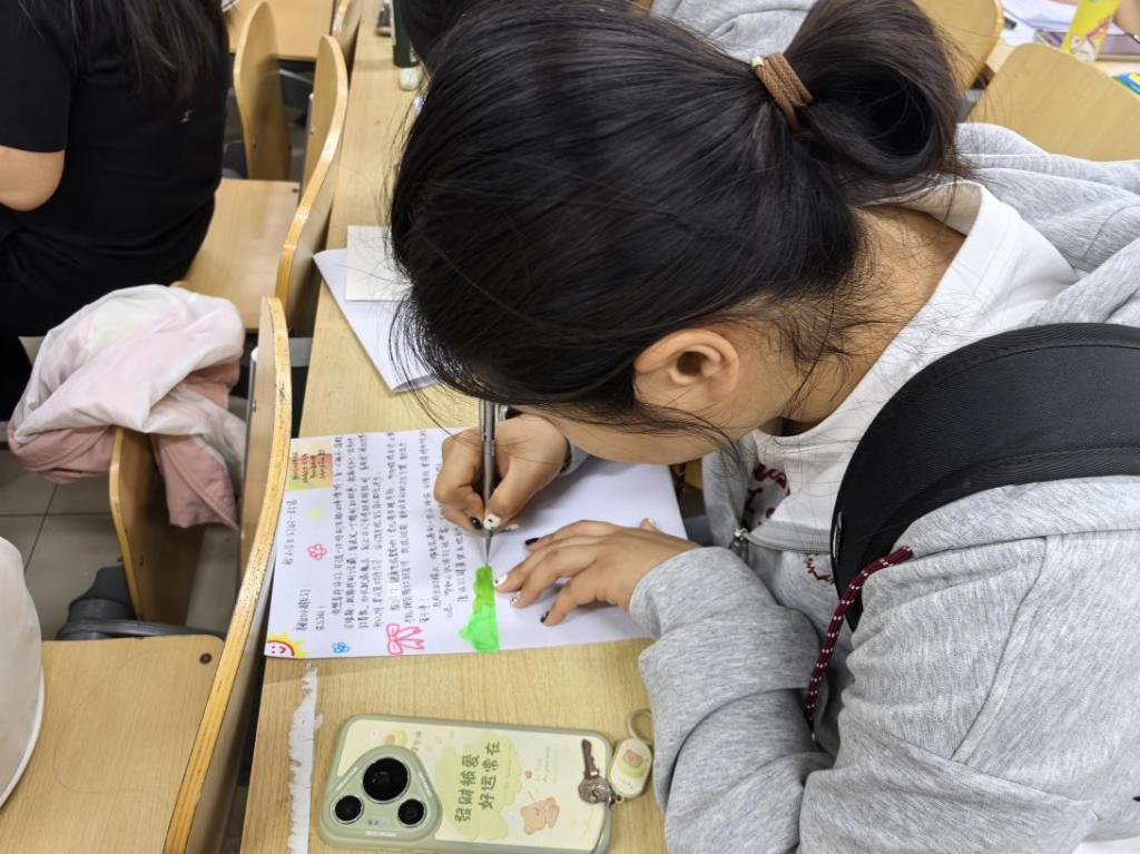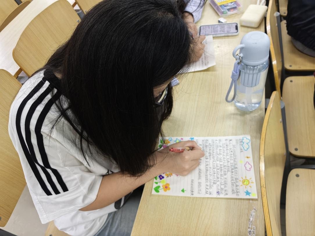 活动分两个阶段进行。第一阶段,同学们充分发挥创意与想象力,精心设计了一张张给小学生的书信。活动现场,彩铅、水彩笔、贴画等装饰材料在同学们手中灵动运用,各种可爱的图案使每封信都充满了童趣与活力。同学们用细腻温柔的笔触,书写着对童年生活的美好回忆,对小学生们的鼓励、祝福与殷切期望,字迹工整秀丽,情感真挚动人。