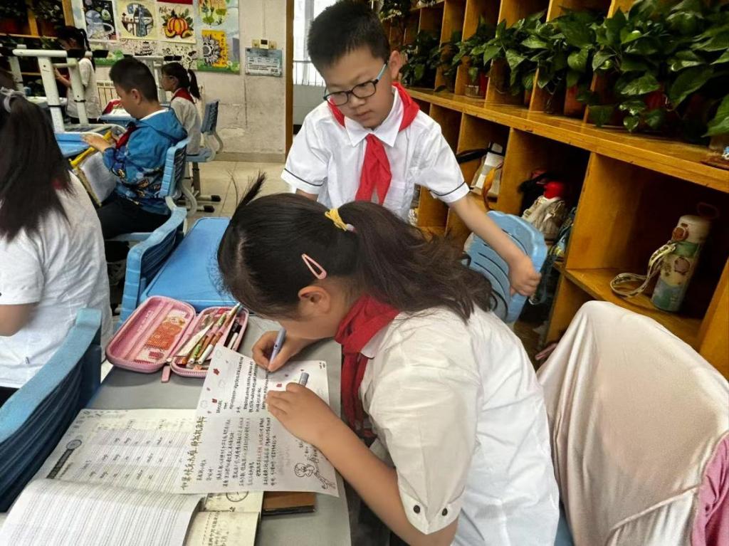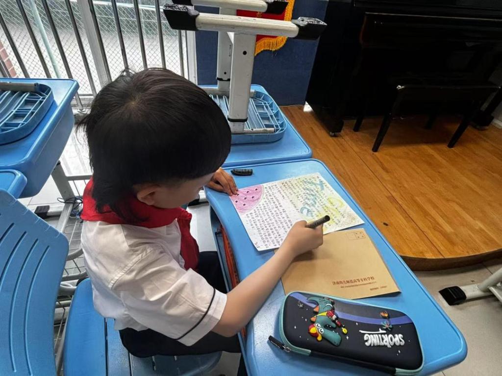 第二阶段,学院实习同学带着饱含爱与温暖的书信前往汇诚小学、长清湖实验小学、泉泽小学等多所学校,进行小学生回信活动。当小学生们收到这些精美的书信时,眼中满是惊喜与兴奋,迫不及待地阅读起来。随后,他们用稚嫩的小手,认真地书写回信,分享着自己生活趣事,以及对大学生活的憧憬与向往。回信结束后,孩子们与书信合影留念,定格下这充满意义的瞬间。