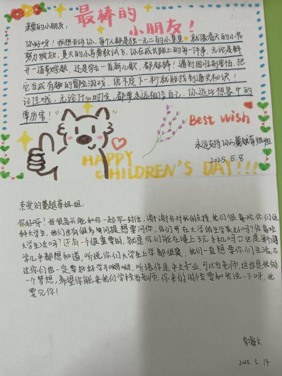 六一携梦来,童年载趣行。这一场书信之旅,如同一场穿越时空的心灵对话。对于大学生而言,这是一份特别的馈赠,他们将自己对童年的怀念与对未来的期许融入信中,小学生的稚嫩纯真的言语治愈了他们的心灵。对于小学生来说,这些书信是来自大哥哥大姐姐的一份惊喜,更是对他们美好的祝愿与期盼。下一步,学院将以此次活动为契机,持续开展更多丰富多彩的交流活动,增加心灵的沟通和情感的交融。