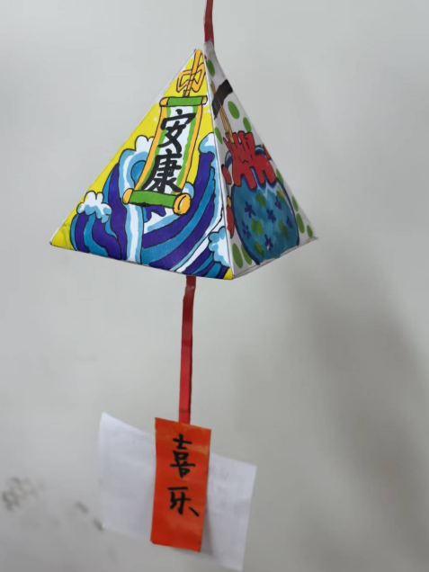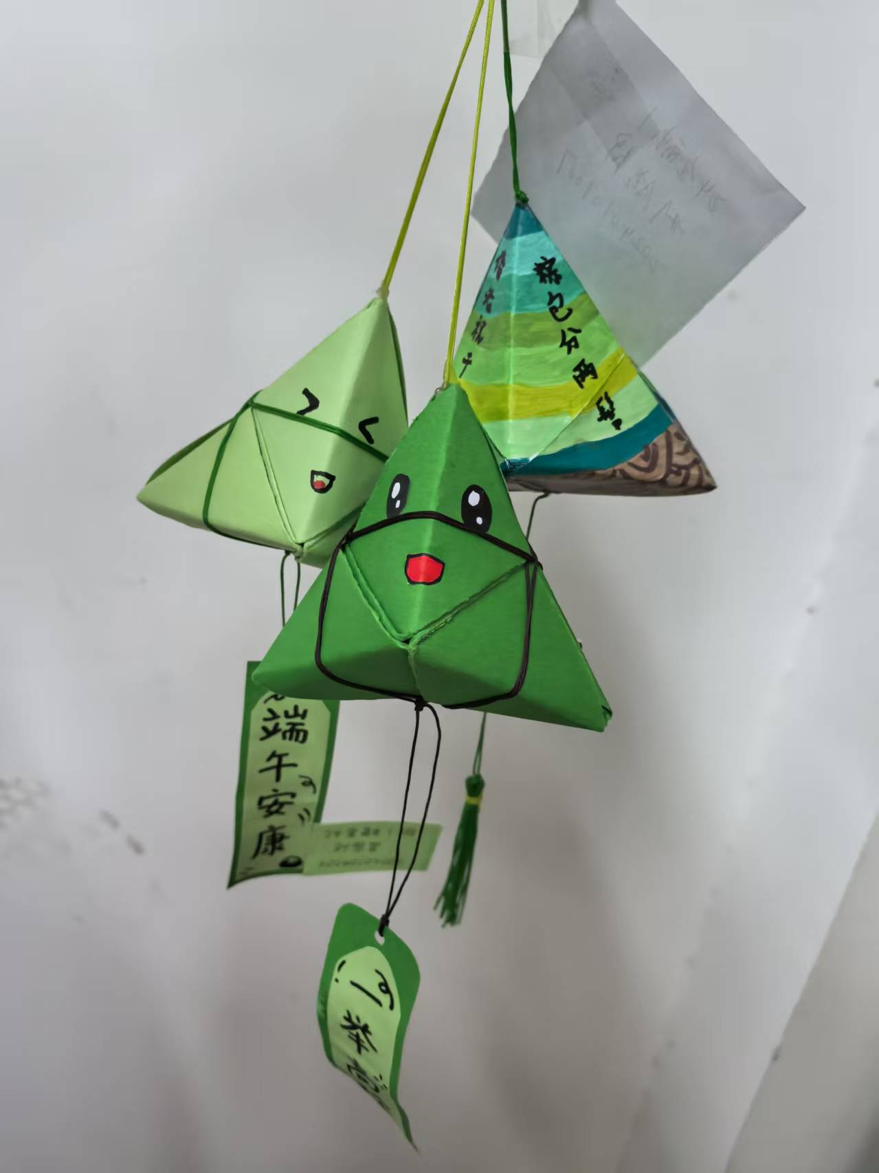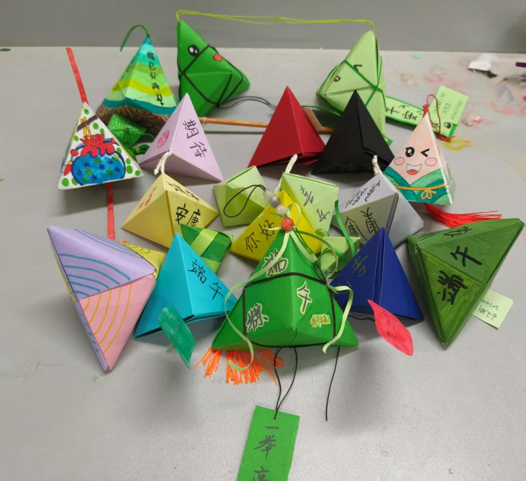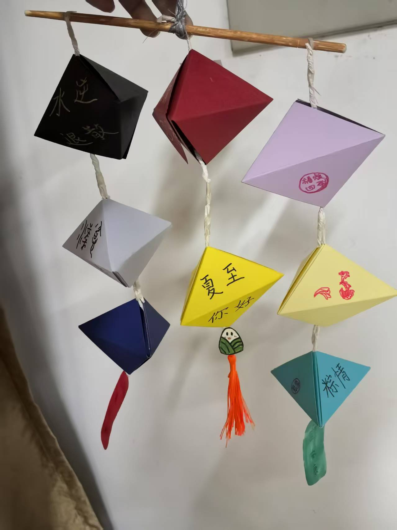 主题创作作品:有的用彩纸和彩线折叠出粽子造型,有的在白色纸粽上用彩笔画出心中的图案,每一个纸粽上都书写着对学业的美好期望。参与者亲手折叠、装饰,在彩纸的翻折缠绕间体验专注手工带来的心流状态,情绪在指尖的创造中悄然舒缓。