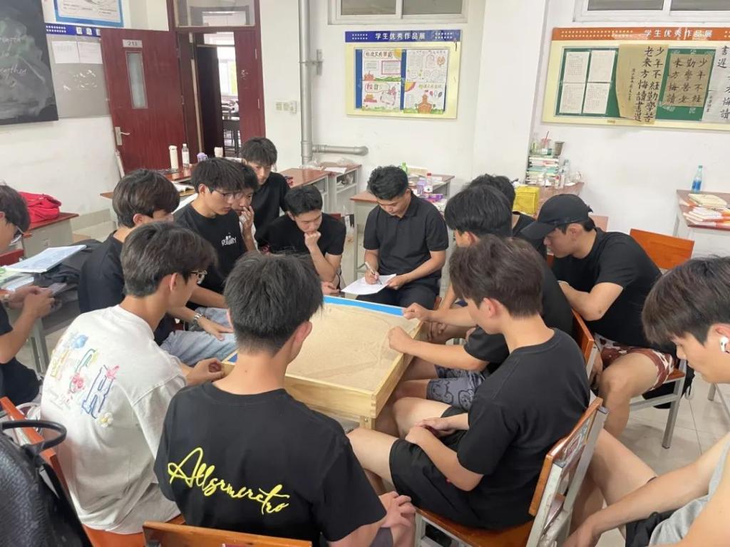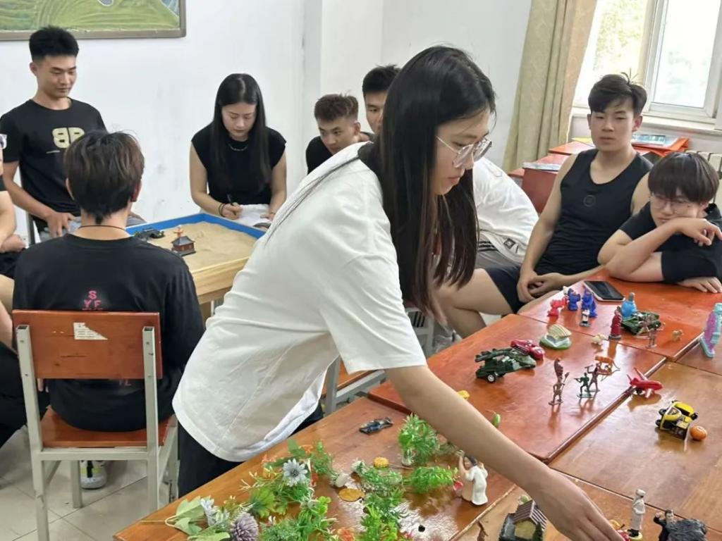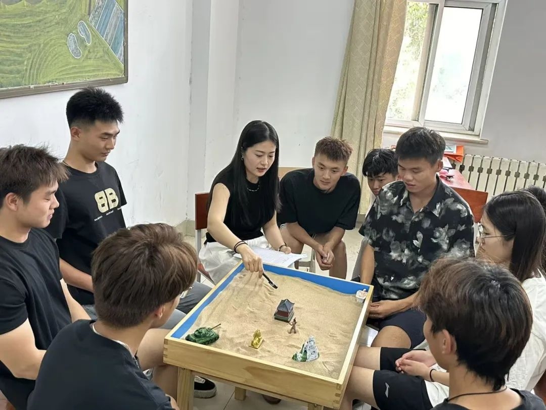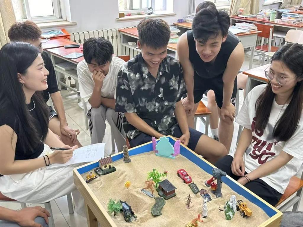 创作结束,一幅承载集体潜意识的沙盘作品诞生。在讨论环节,同学们自由分享对沙盘的理解与感受,思想的火花在交流中迸发,彼此的心灵距离悄然拉近。最后,大家共同为沙盘命名,赋予作品温暖的集体记忆。