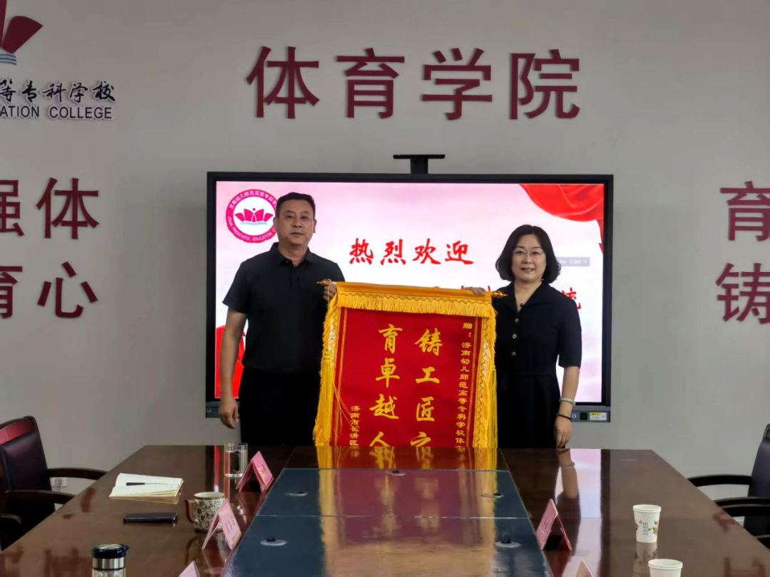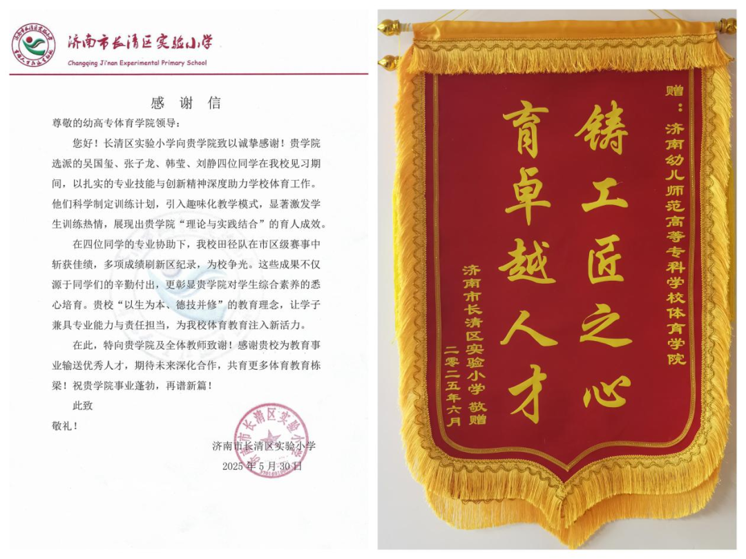 6月12日,长清区实验小学校长赵珊,体育教研室主任李站、董淑娟一行三人来到我校。特向我院送来锦旗和感谢信,高度赞扬我院2023级体育教育专业4名见习生在为期1个月的教育见习中展现出的专业素养与奉献精神,双方合作育人成果获得充分肯定。