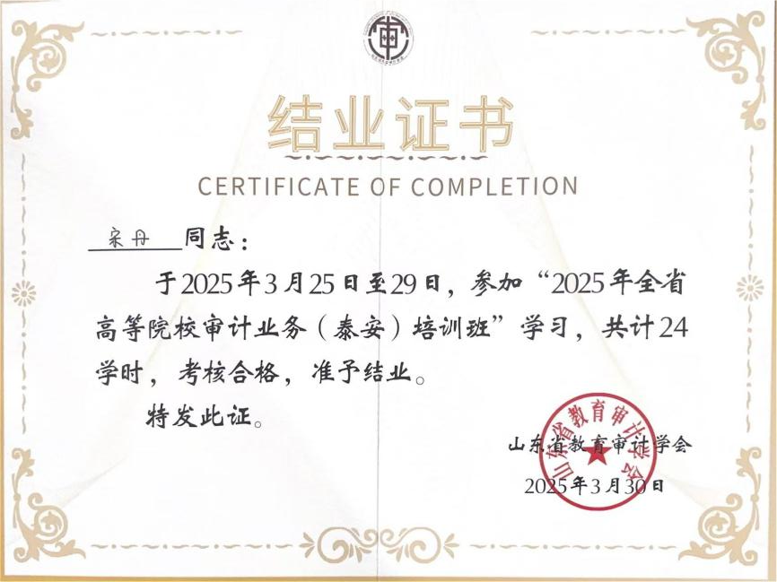 一是充电蓄能,提升专业能力。选派人员参加山东省教育审计学会2025年全省高校审计业务(泰安)培训班,此次培训聚焦教育审计政策解读、风险防控、大数据审计等前沿课题,通过案例研讨、经验交流等形式,提升审计人员的专业能力和实战水平。