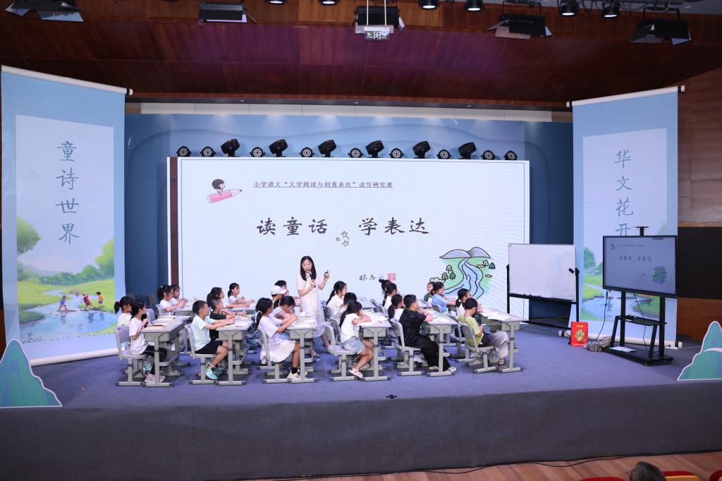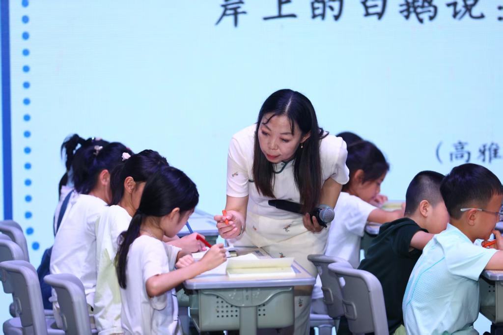 活动的核心环节,“童诗课堂”邀请了山东、江苏、广东、浙江、四川、上海等地六位全国诗教名师、作家与诗人现场授课。我校儿童阅读研究所所长、林志芳博士执教精彩观摩课《两只鹅》。课堂上,她以童趣盎然的互动设计引导孩子们走进童诗世界,通过角色扮演、意象联想等方式,让孩子们在游戏中感受语言的韵律与诗意的灵动,赢得在场师生的热烈掌声。