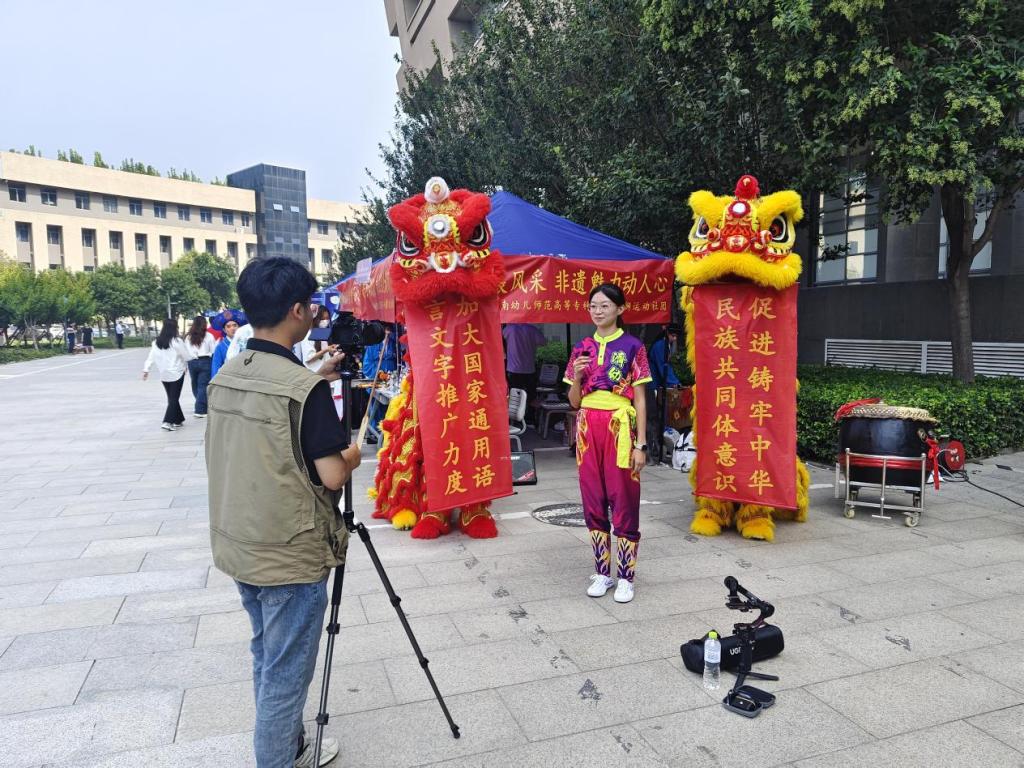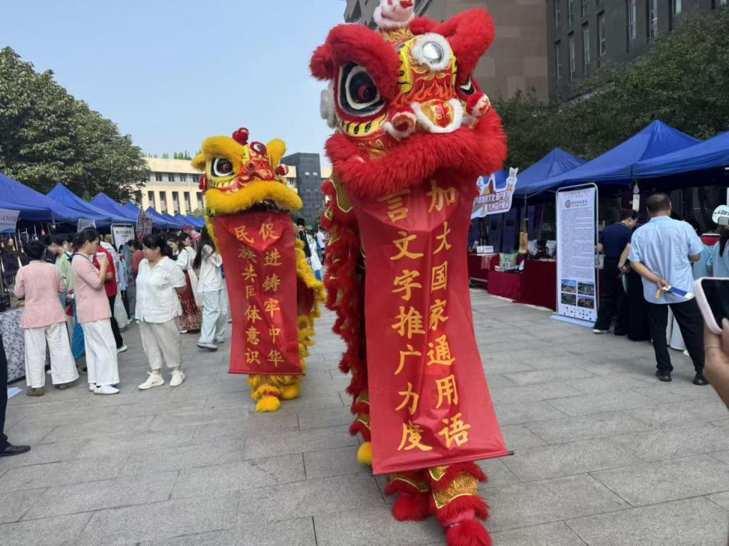 狮舞助兴,活力传声。体育学院刘鹏老师指导的龙狮运动社团,以一场气势恢宏的舞狮表演点燃现场气氛。表演当中舞狮展现出的横幅正是今年推普周的活动主题,将“加大国家通用语言文字推广力度,促进铸牢中华民族共同体意识” 的推普主题融入传统民俗展示,实现 “文化传播+语言推广” 的双重效果。
